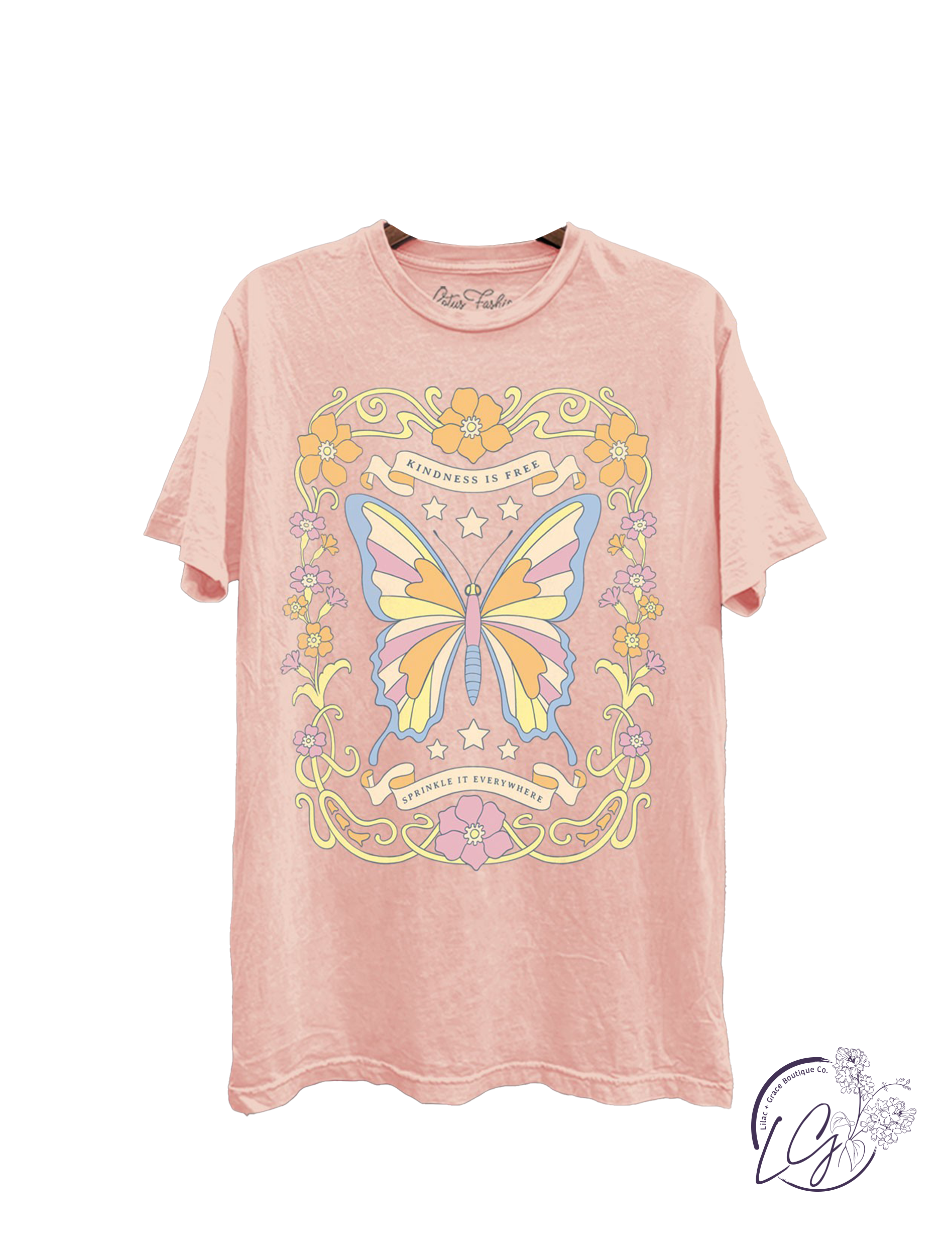 This Curvy Kindness Is Free Butterfly Graphic Top is a must-have for any plus-size fashionista. Made in soft 100% cotton fabric, it is comfortable and stylish. The short sleeve crew neck and open neckline with dropped sleeves make for a loose and flattering fit. The beautiful lotus and butterfly graphic adds an element of nature and kindness to this mineral washed top. Get yours today and spread the message of compassion in style!