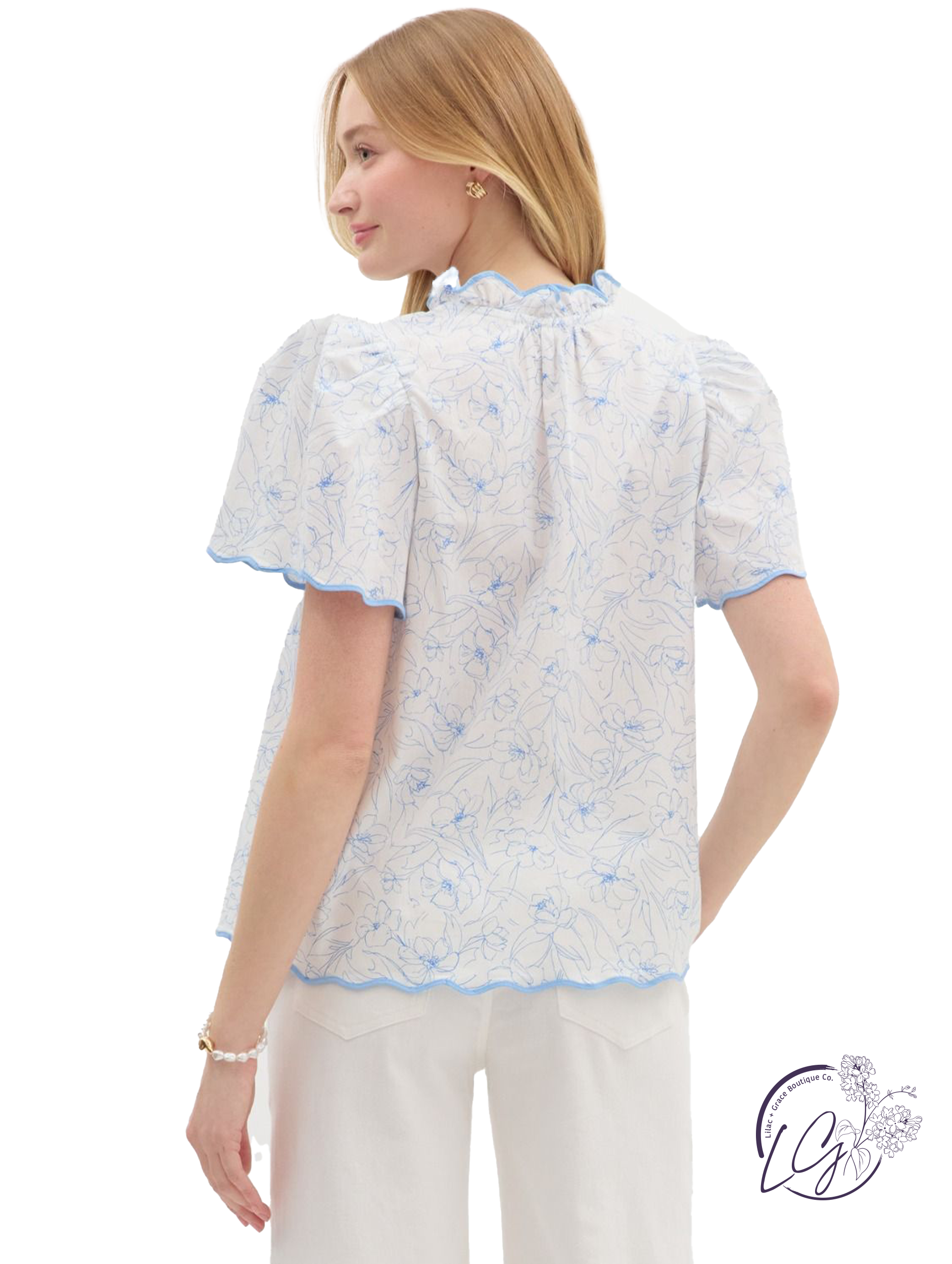 This floral print pullover top features a split V-neckline and delicate scallop pattern accents for added texture and charm. The lightweight fabric and relaxed fit make it ideal for warm days, while the soft floral print adds a feminine touch. Pair it with denim or linen trousers for an easy, polished look with a hint of detail.