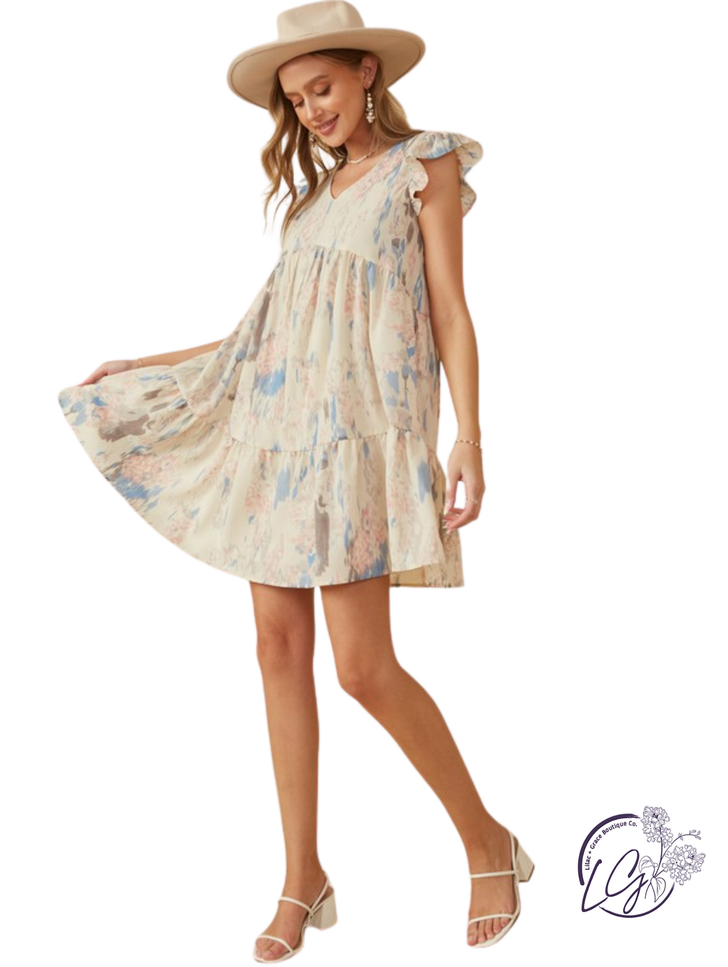 This dress features a soft watercolor print on lightweight fabric, with a flattering V-cut neckline and tiered ruffle detailing for a graceful, flowing silhouette. Fully lined for comfort and coverage, it’s the perfect blend of color and femininity.