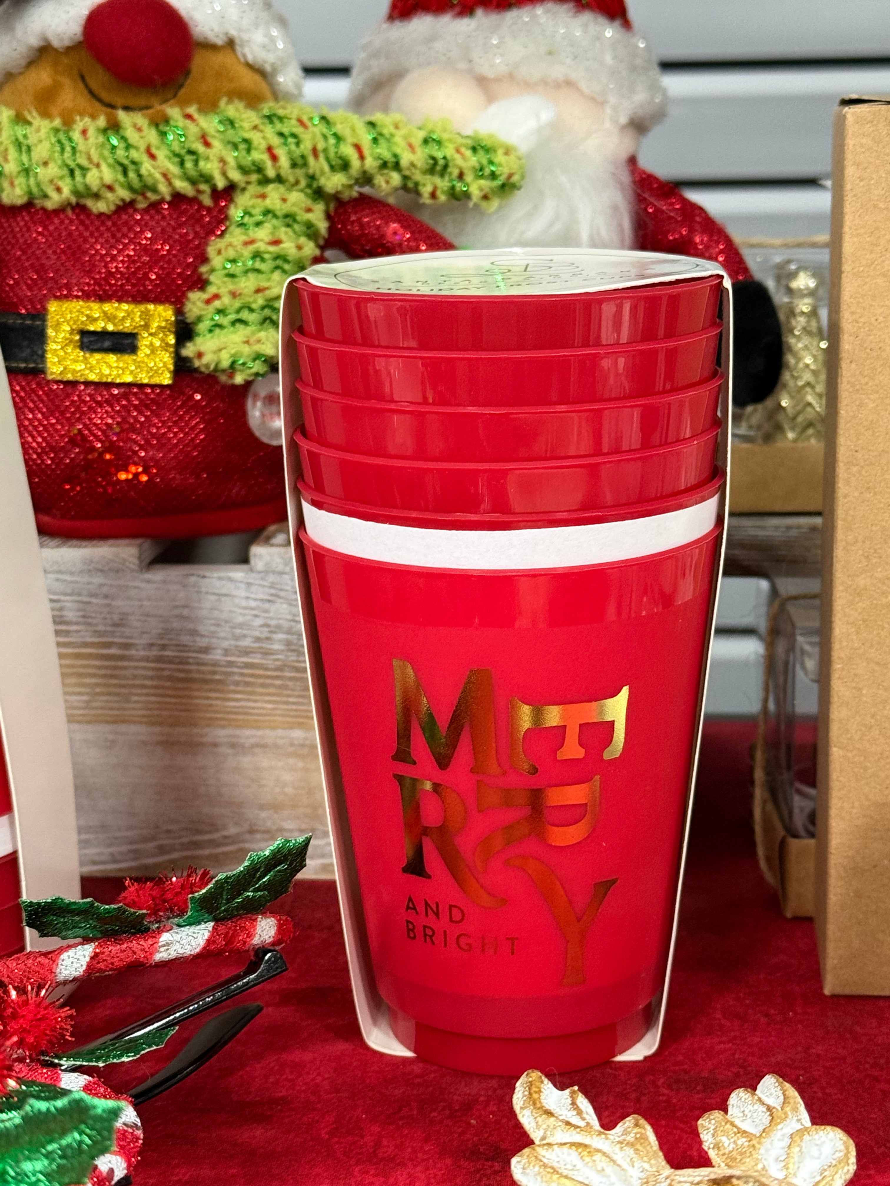 Each cup is adorned with the elegant "Merry" script in shimmering gold foil, adding a sophisticated and celebratory element to your drinkware. The translucent frost finish of the cups provides a subtle and stylish backdrop, creating a harmonious blend of chic design and festive spirit.