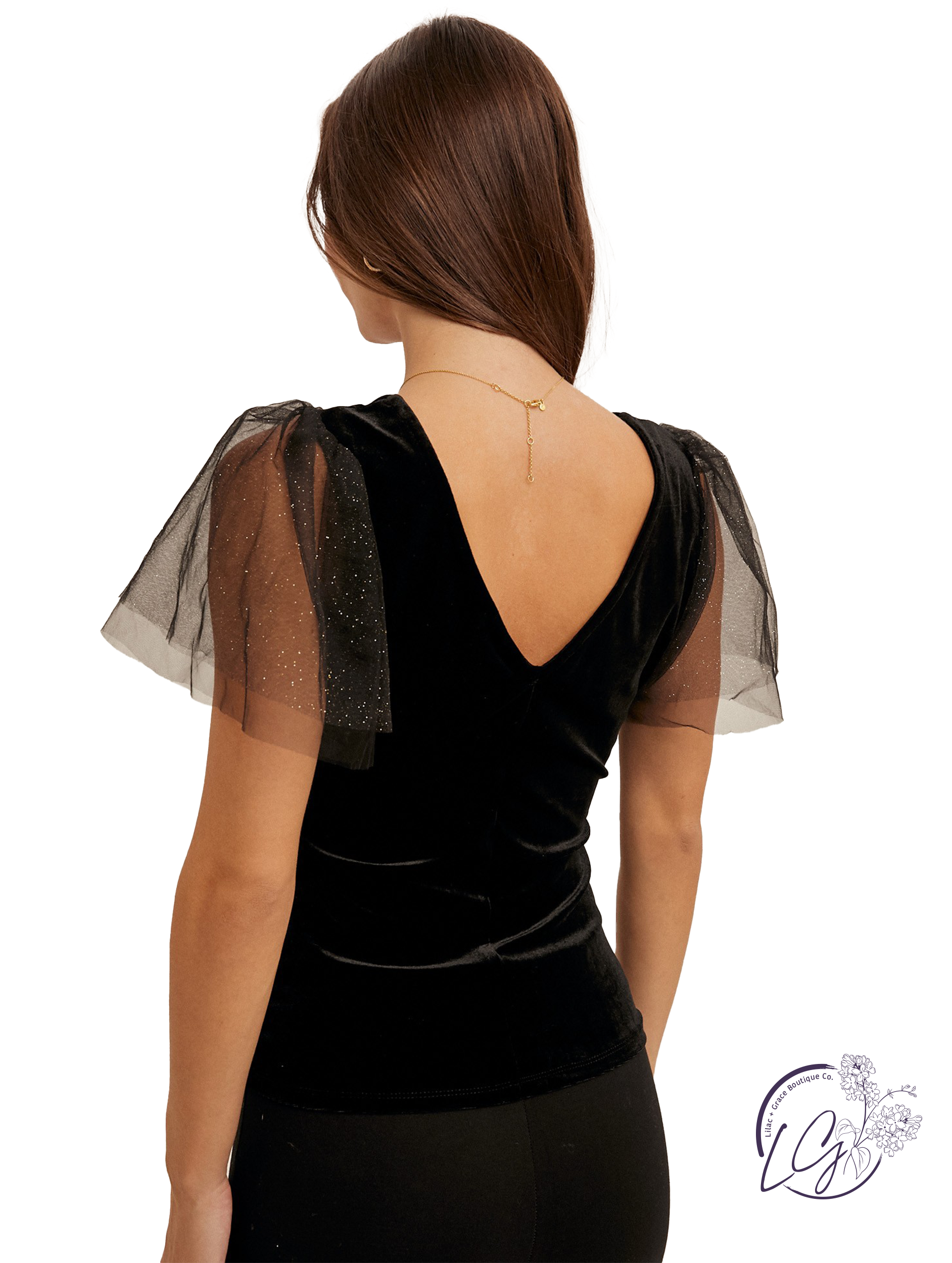 The Midnight Spark Top is a captivating blend of elegance and edge. Crafted from luxurious velvet, this V-neck top features sheer tulle sleeves dusted with subtle glitter that catches the light with every move. The deep, rich color adds a sense of mystery, while the shimmering accents create a radiant look perfect for evening outings or special occasions. Designed for those who love to stand out, the Midnight Spark Top effortlessly combines sophistication with a touch of sparkle.