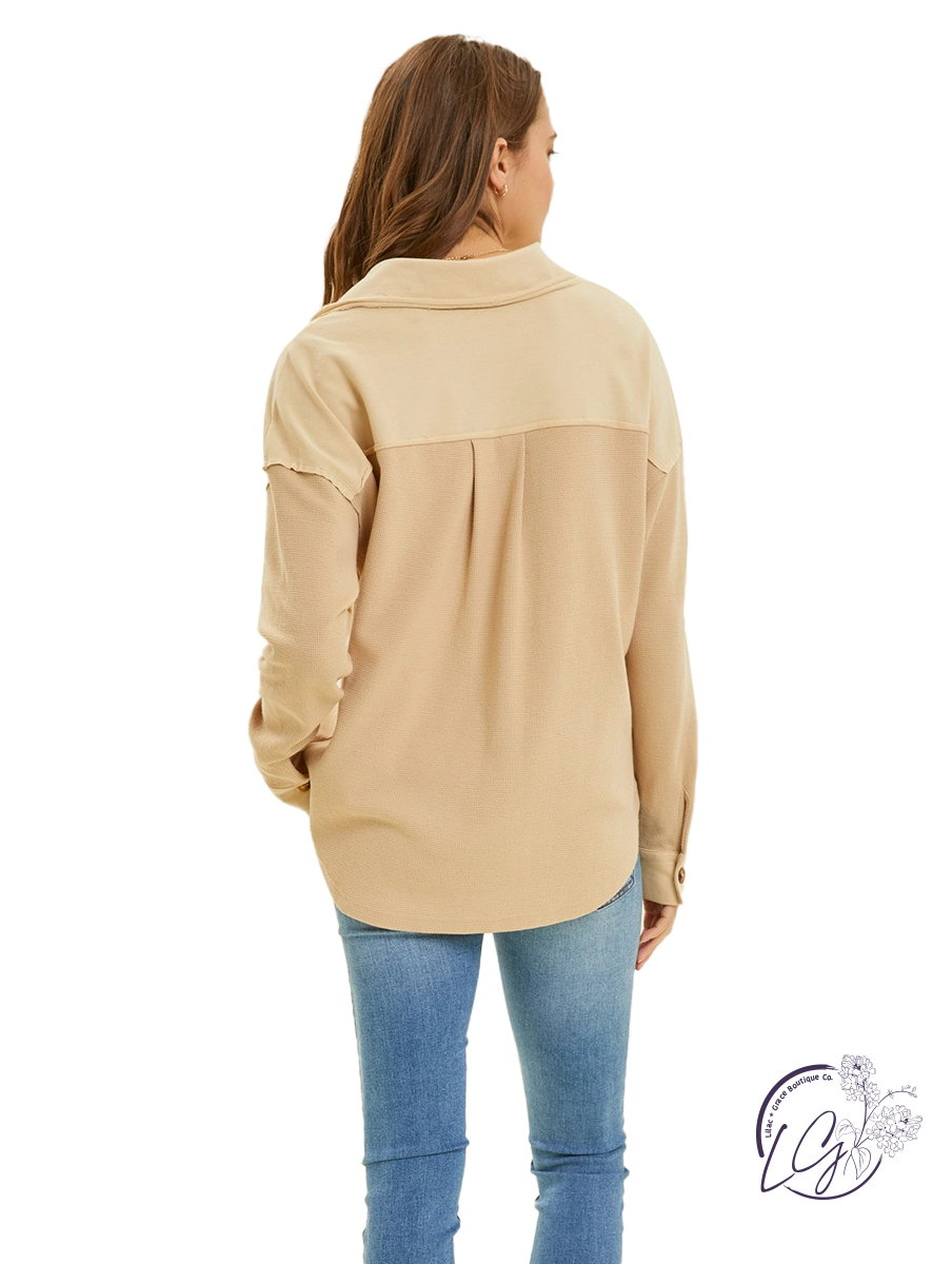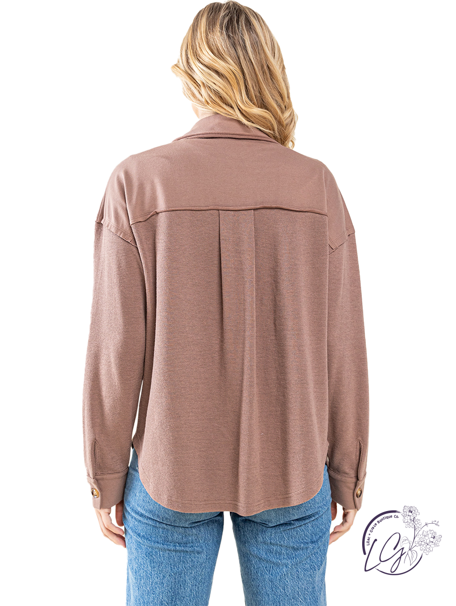 The Street Style Oversized Shacket is a fashion-forward outerwear piece that combines the comfort of thermal fabric with the urban edge of terry cloth. This versatile garment features an oversized silhouette, perfect for achieving an effortlessly cool streetwear look. The mixed textures add visual interest and dimension, while the button-down front and shirt collar maintain a classic vibe. Whether layered over a casual outfit for added warmth or worn as a lightweight jacket, the Street Style Oversized Shacket is sure to elevate your street style game with its edgy yet comfortable design.