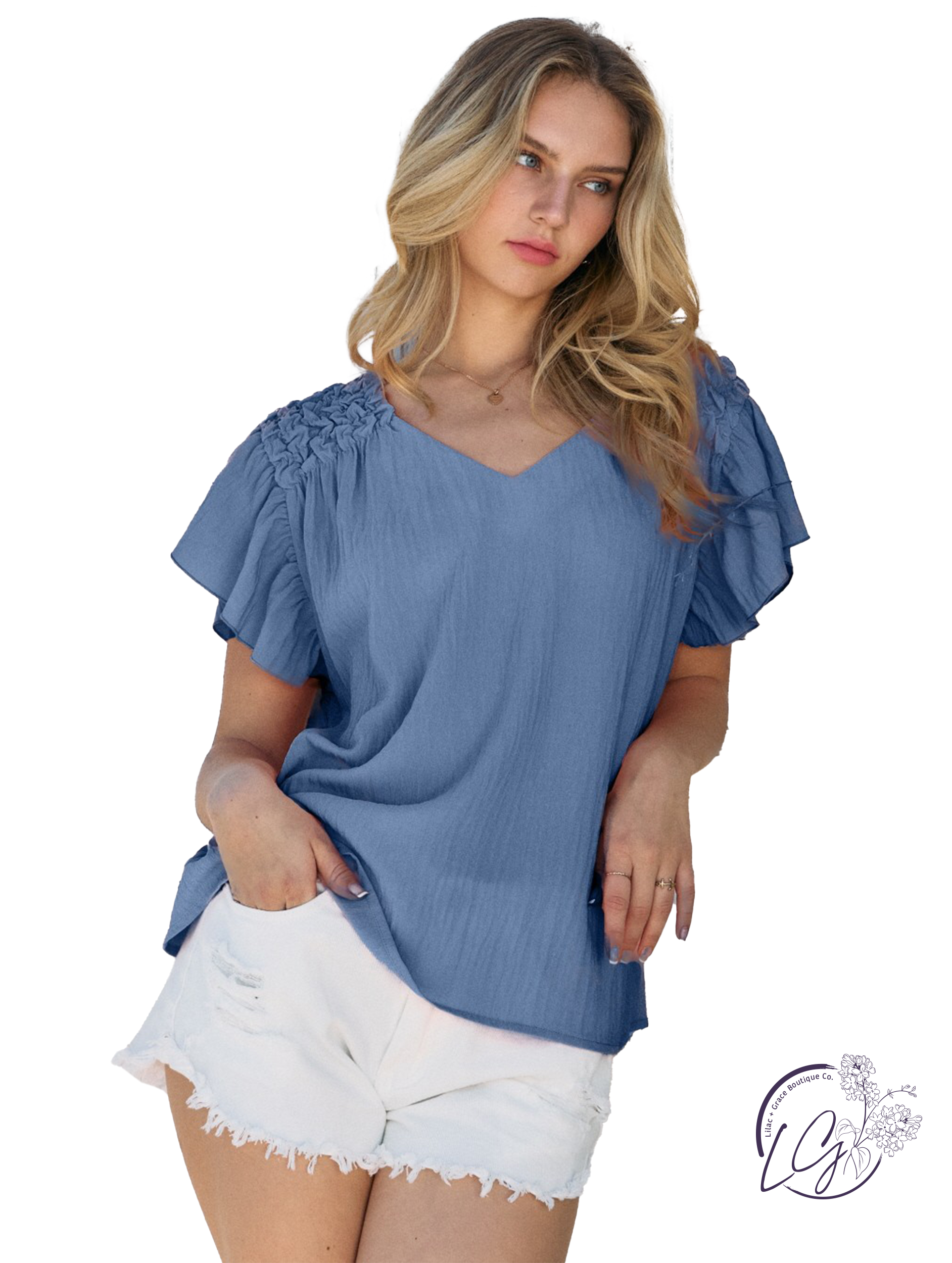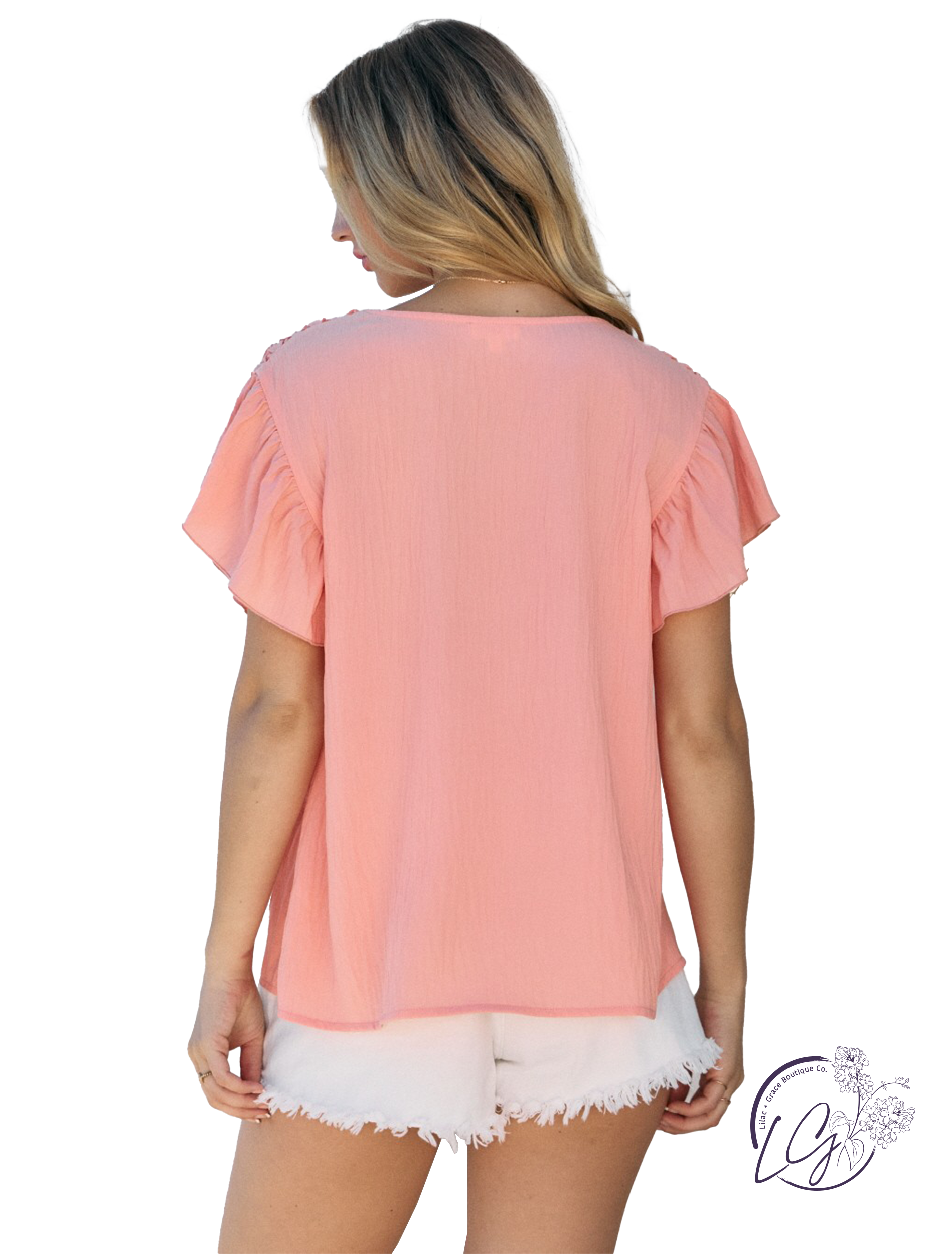 Experience the perfect blend of style and comfort with our Peachy Sunset Glow Blouse! This solid woven blouse features a unique shoulder smocked detail and ruffle short sleeves for a playful yet sophisticated look. Elevate your wardrobe and add a touch of effortless elegance to your outfit.