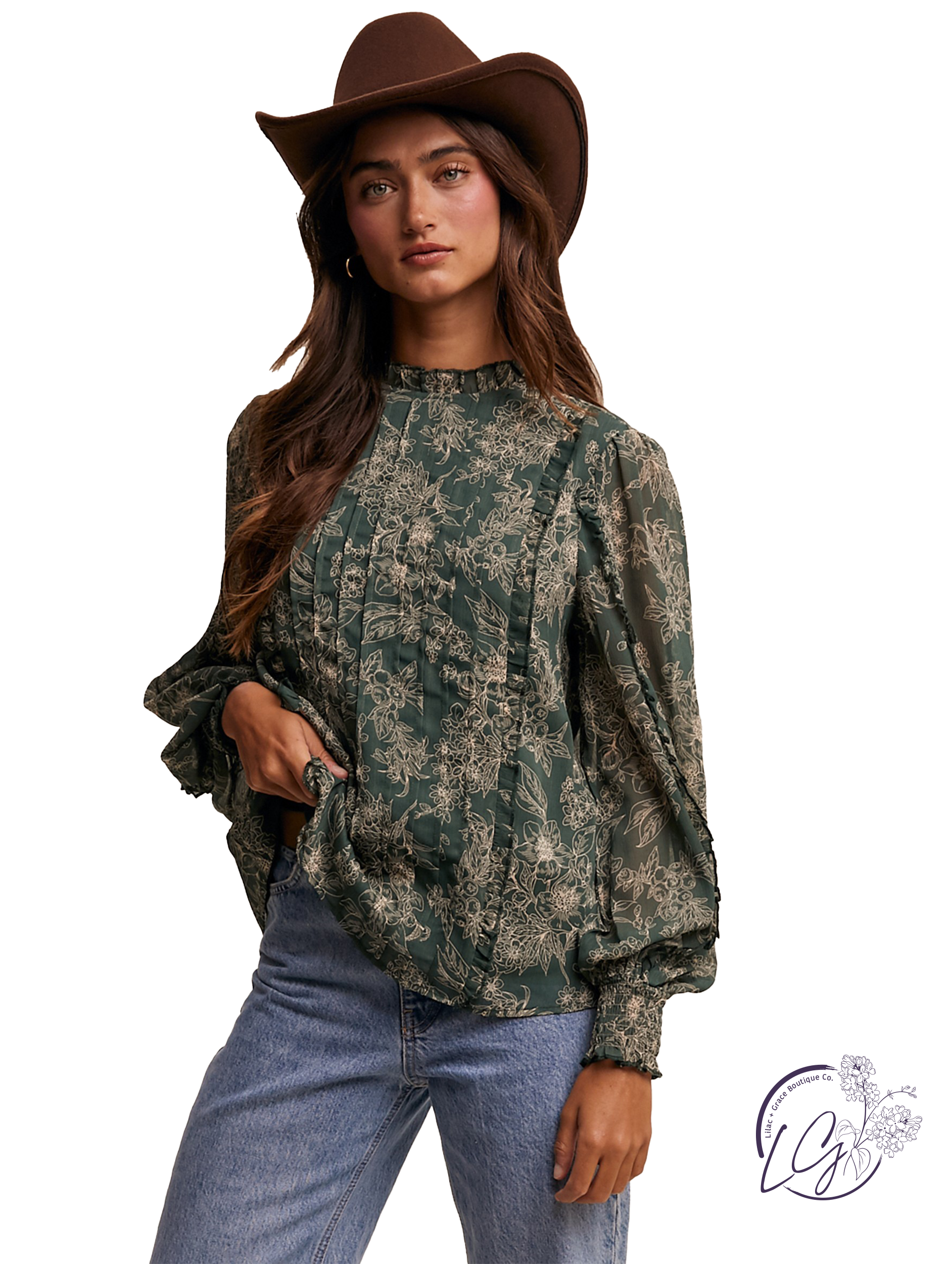 Embrace effortless elegance with the Petal Pleat Top. This floral print blouse features a charming ruffle neck and a keyhole closure at the back for a delicate touch. The pleated design, enhanced with ruffles on the front body and sleeves, adds a playful yet sophisticated flair. Long sleeves with smocked cuffs create a flattering silhouette, while the clean hem and lining provide a polished finish. Perfect for both casual and dressy occasions, this top is a versatile addition to your wardrobe