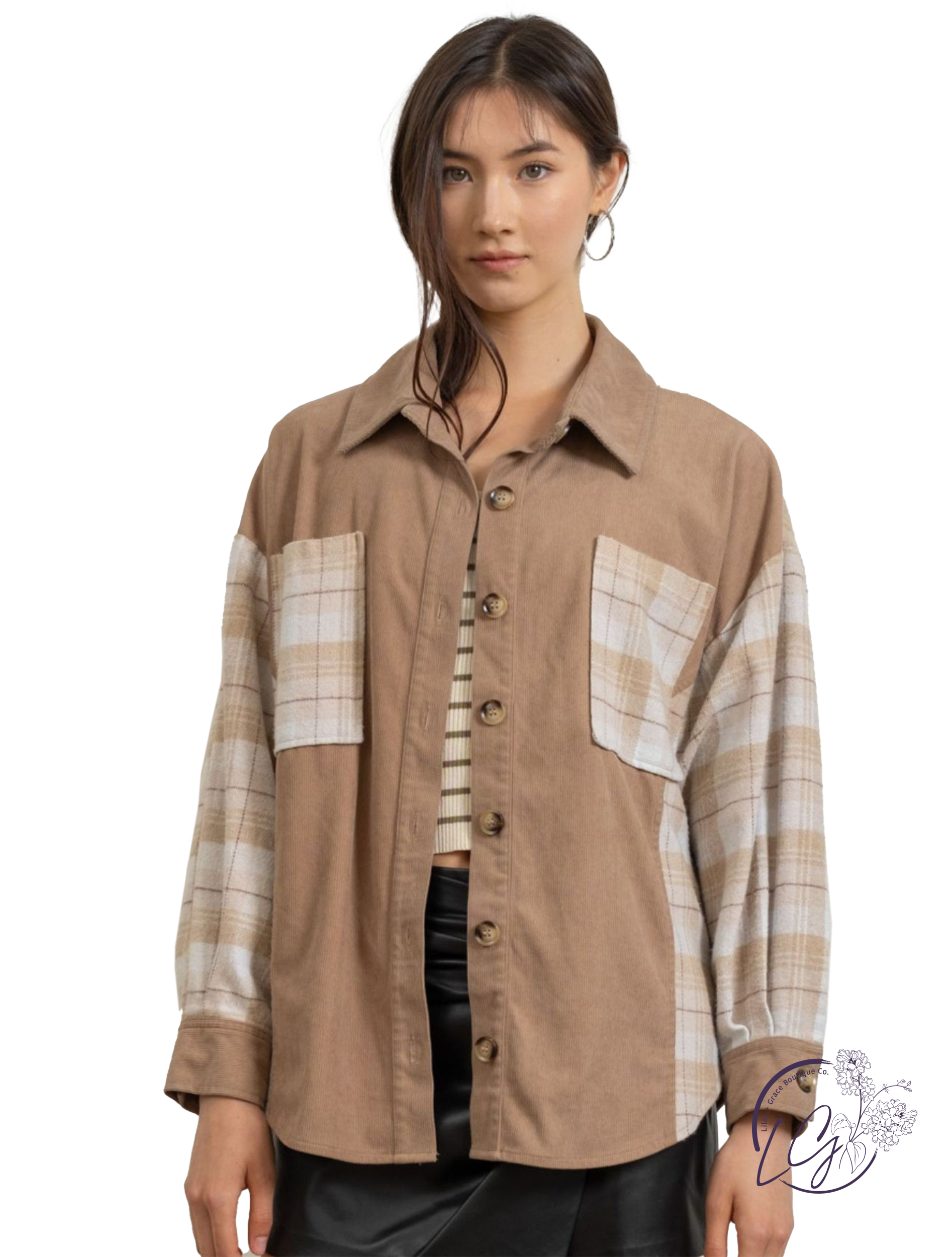Stay cozy and stylish in our Plaid Patchwork Shacket. The soft and durable corduroy fabric provides warmth while the eye-catching plaid patches make it stand out. With a relaxed fit and functional pockets, this shacket is perfect for transitional weather. Wear it open as a jacket or buttoned up as a shirt.