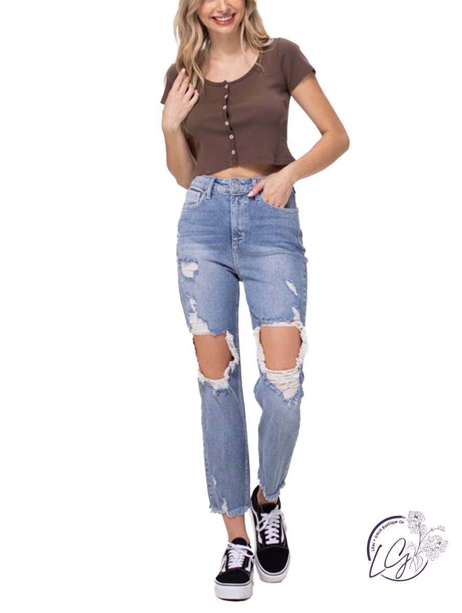 A Cello classic, this high-rise jean is a relaxed take on a classic boyfriend jean and intended to be worn slightly roomy. Style yours with an oversize atop a button-down shirt to offset the tattered rip detailing. Additionally equipped with five pockets, belt loops, a zip fly closure.