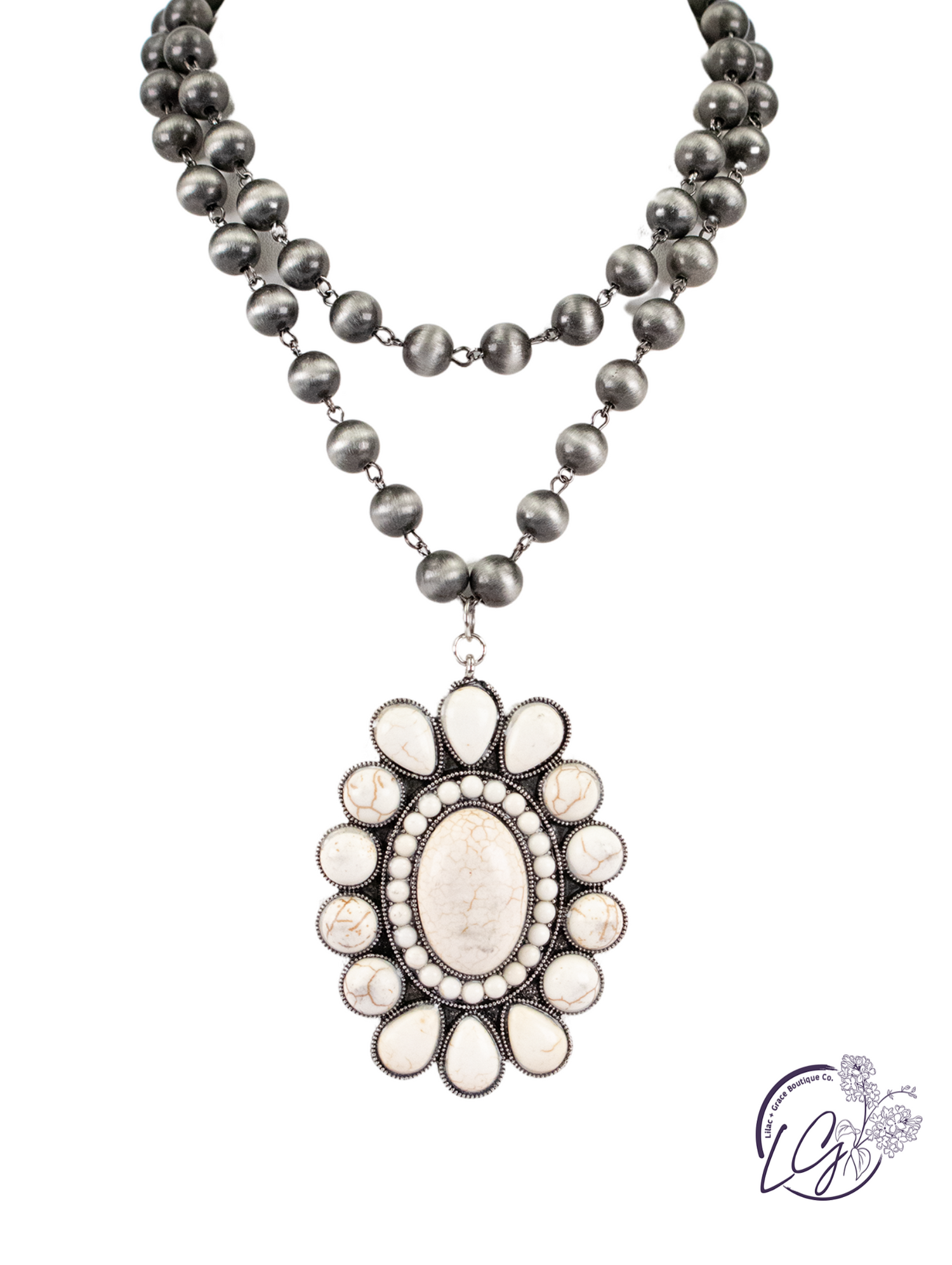 This bold and beautiful necklace features oversized gunmetal beads paired with a vibrant floral-style pendant. Choose from four eye-catching center stones—hot pink, turquoise, soft pink, or ivory—each framed with coordinating accent stones for a striking Western-inspired look. At 15 inches long, this necklace is designed to make a statement whether you wear it solo or layered. Perfect for rodeo season, country concerts, or adding a pop of color to any outfit.