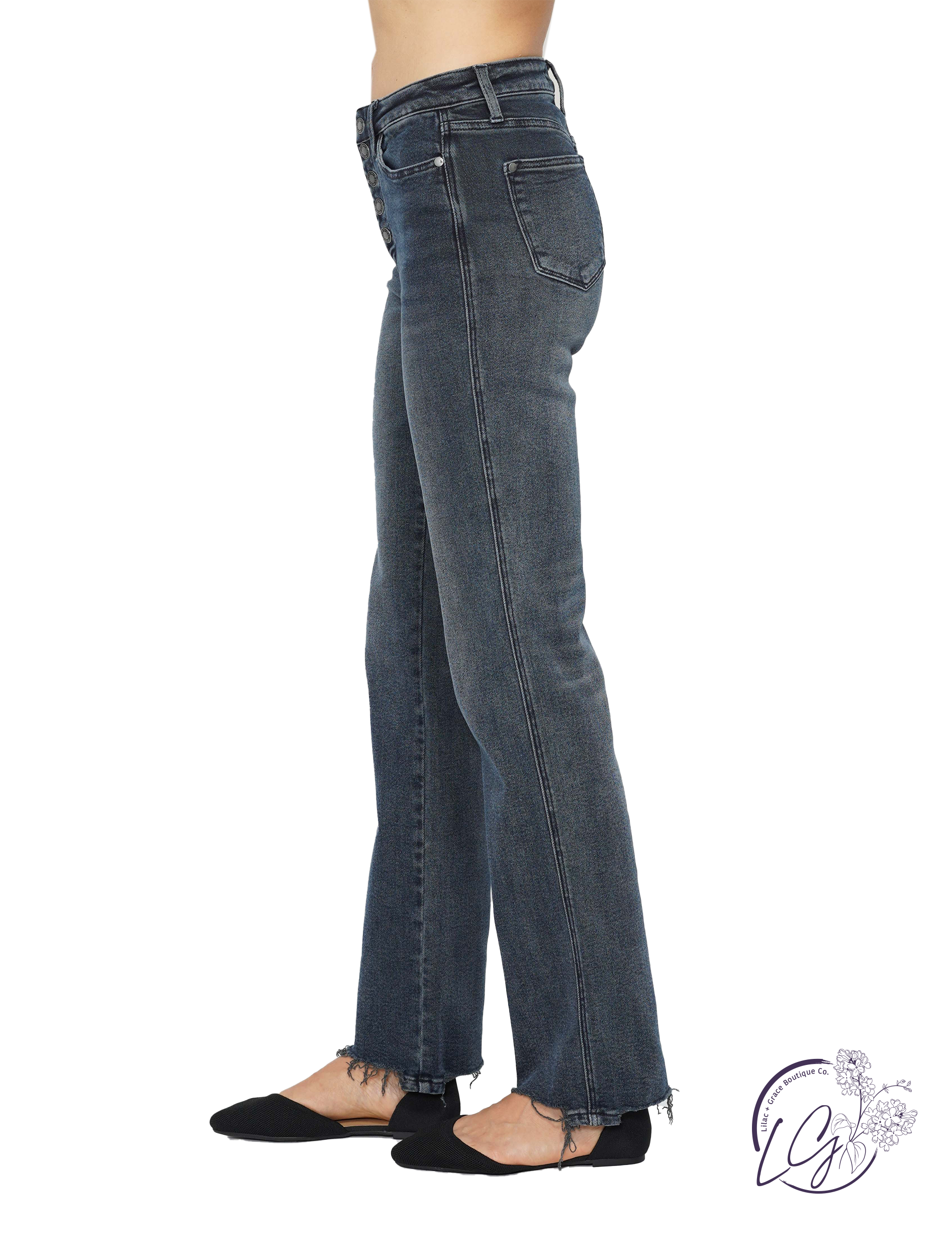 Featuring a sleek button-fly closure, subtle distressing, and a raw hem, these jeans bring a lived-in feel while maintaining a classic silhouette. The straight-leg cut elongates the figure, making them a versatile staple for effortless styling. Crafted from a soft, stretchy denim blend, they provide all-day comfort while keeping their shape.