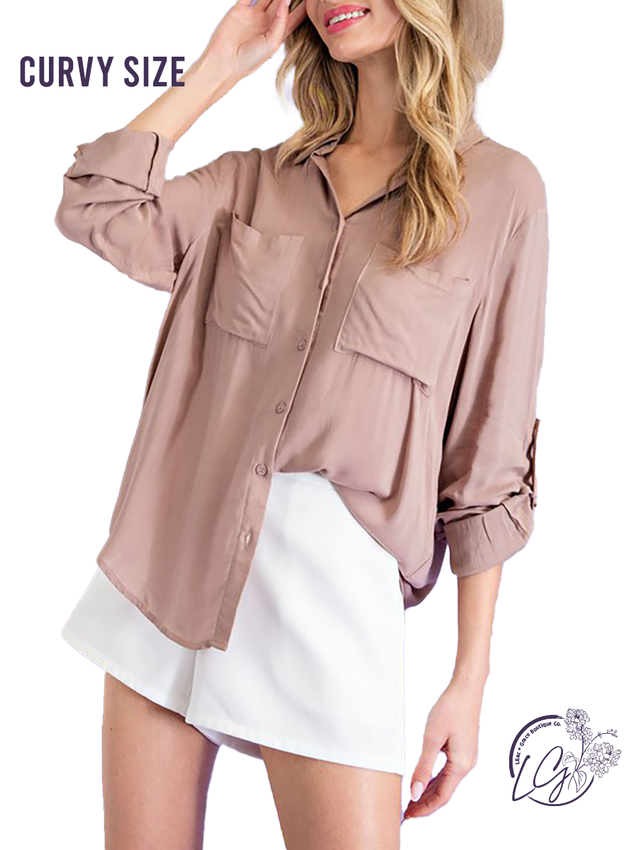 Curvy button down top with long roll tab sleeves, pointed collar, and front pockets