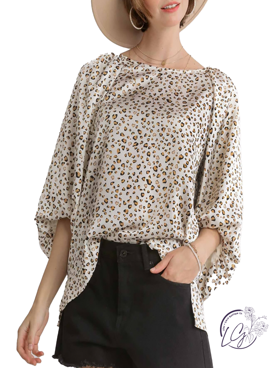 Animal Print Round Neck Balloon Sleeve Top with Side Splits