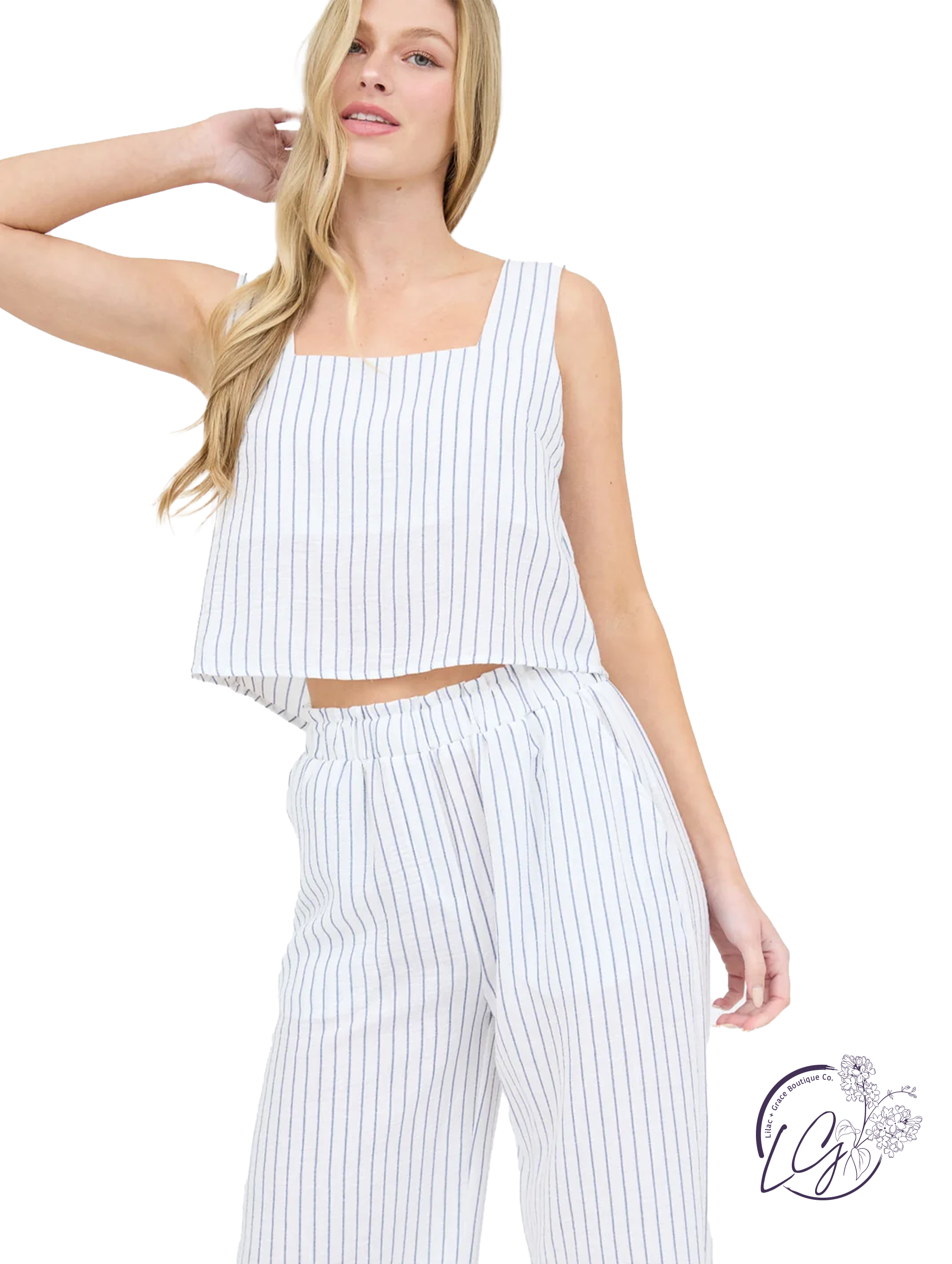 The sleeveless cropped tank features a structured square neckline with side pin tuck accents and a subtle stripe pattern throughout. Made from lightweight, fully lined polyester, it offers an airy feel with a clean finish. Paired with high-waisted wide leg pants, complete with an elastic waistband and pockets for added ease and function.