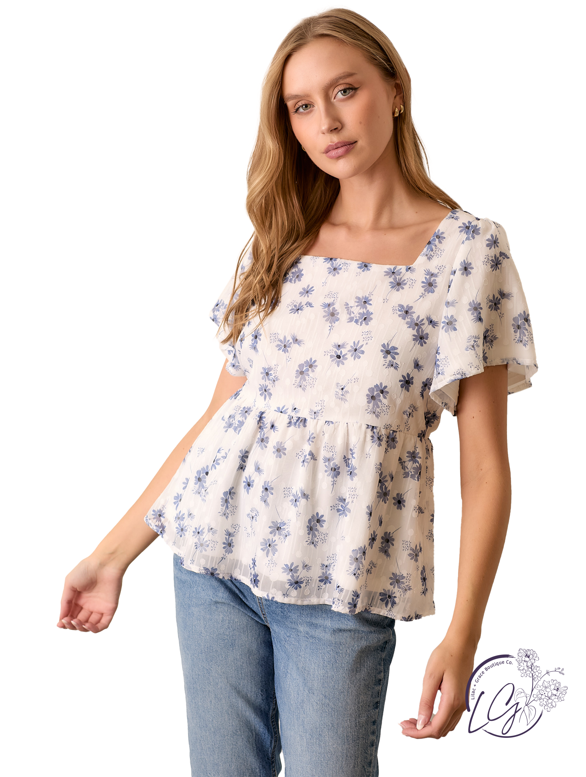 This textured woven top features a structured square neckline paired with soft, flowy sleeves for a balance of shape and movement. The lightweight fabric drapes gently, making it ideal for warm days or layering under jackets. Style it with high-rise denim or a midi skirt for a clean, effortless look.