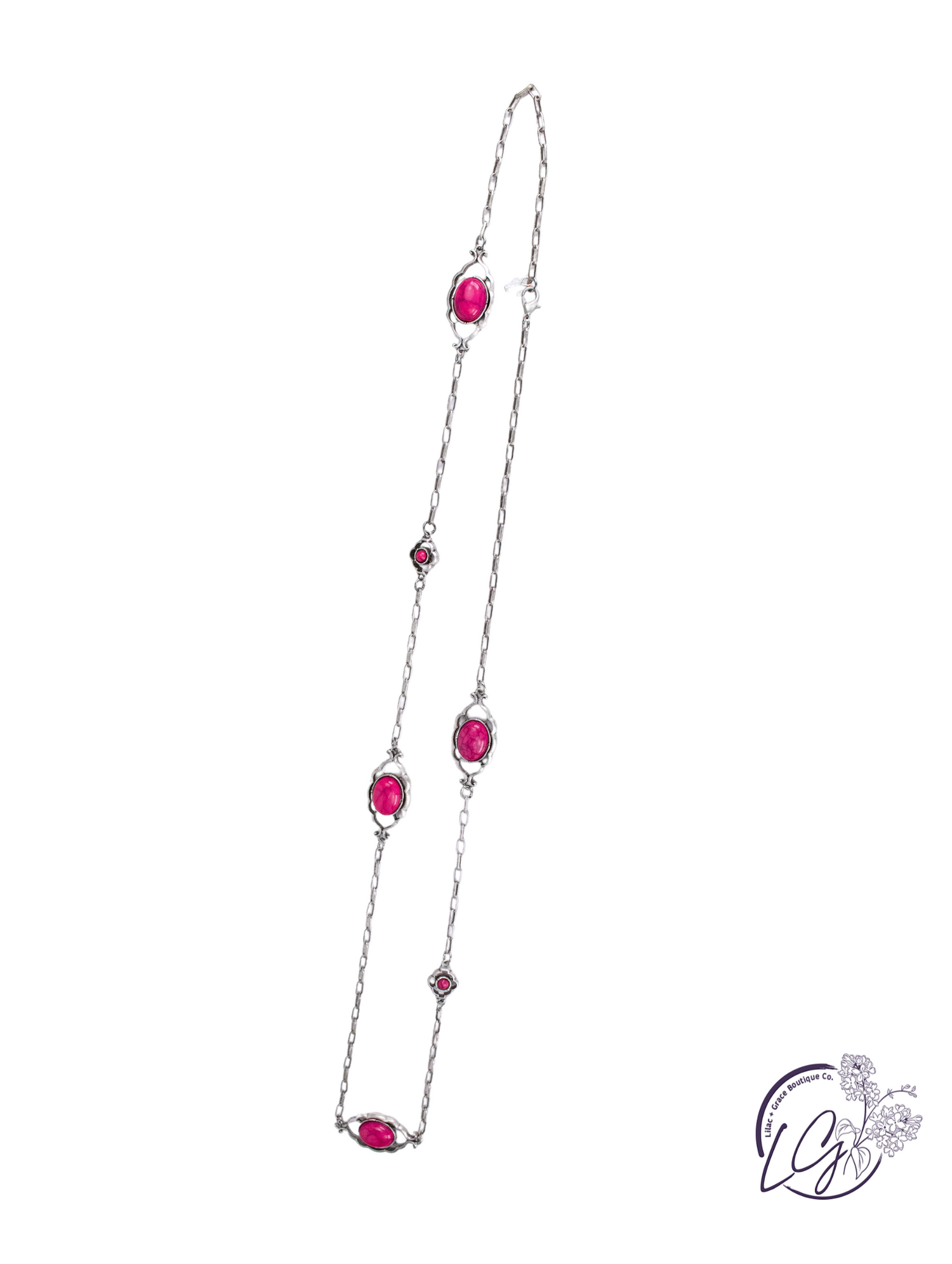 Bring vintage charm to your everyday look with the Sierra Trails Pendant Necklace. This 15-inch necklace features an antique silver chain with oval stone settings spaced throughout, offering a blend of rustic elegance and southwestern flair. Choose from vibrant turquoise, soft pink, or bold fuchsia stones to complement your style. Lightweight yet striking, it layers beautifully or shines on its own. Finished with a lobster clasp for secure wear.