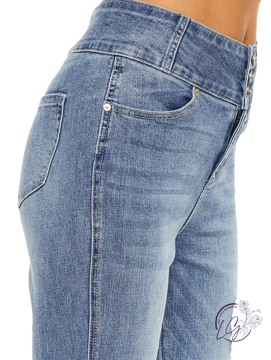 The Skylar High Rise Hem Detail Flare by Kancan is a trendy and stylish option that adds a unique touch to your denim collection. Featuring a high-rise waistline, these jeans sit comfortably at the natural waist, providing a flattering fit and elongating the legs. The flare leg silhouette adds a retro-inspired vibe, with a wider leg opening that flares out from the knee down. What sets these jeans apart is the hem detail, which includes intricate embroidery, frayed edges, or other decorative elements that add texture and visual interest to the bottom hem. Crafted from quality denim fabric with a hint of stretch, these jeans offer comfort and flexibility for all-day wear. Perfect for pairing with a tucked-in blouse or cropped top, the Skylar High Rise Hem Detail Flare by Kancan is sure to make a statement and elevate your everyday look.