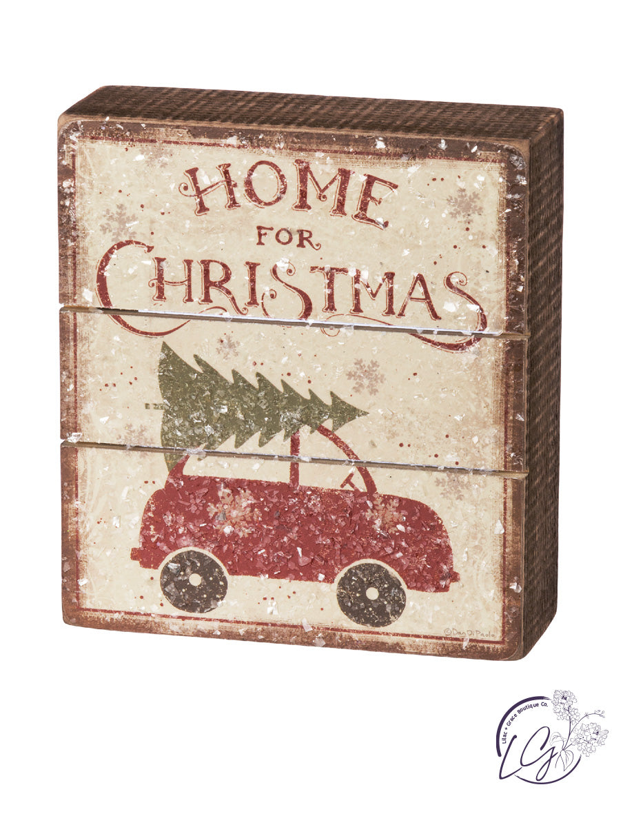 A rustic-inspired wooden box sign for Christmas lending distressed "Home For Christmas" sentiment and snowy car with tree design. Easy to hang or can free-stand alone. Complements well with coordinating design pieces for a festive collection.