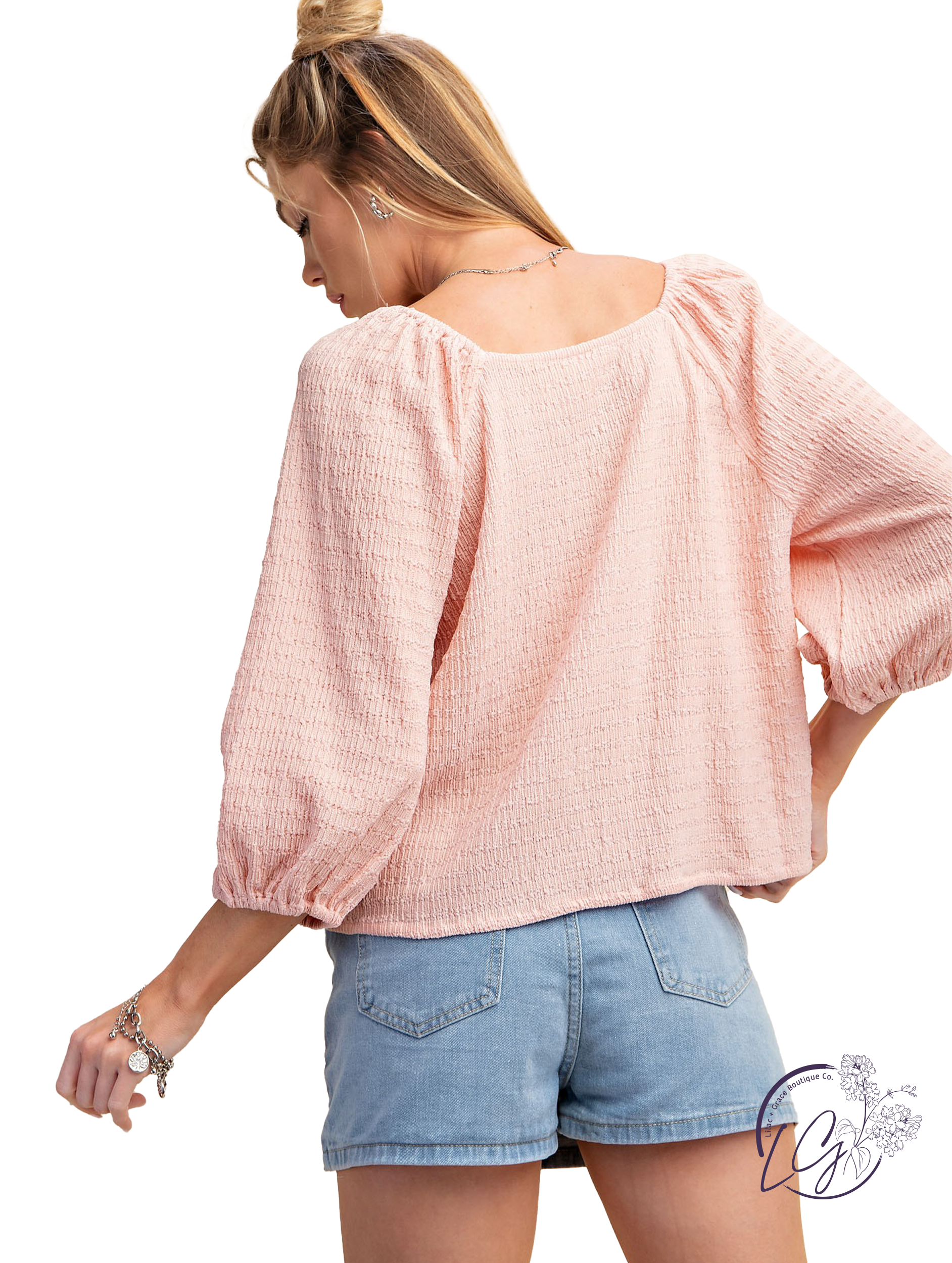 Indulge in luxury and comfort with our Soft Cloud Bubble Top! The V-neck design and bubble sleeves add a touch of elegance and playfulness. Perfect for any occasion, the 3/4 sleeves provide versatility while the solid color allows for effortless styling. Treat yourself to a cloud-like experience today!