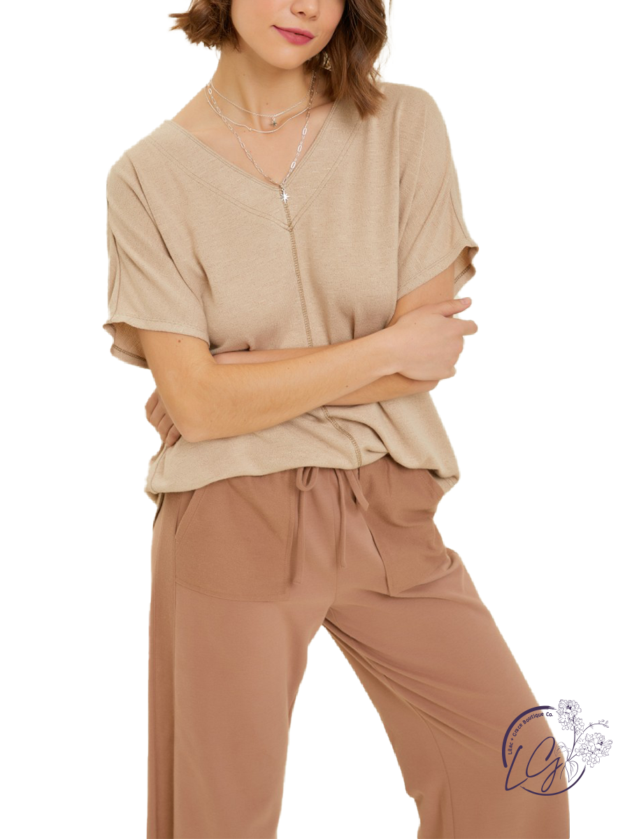 The dolman sleeves bring a relaxed and effortlessly chic vibe to the top, allowing for ease of movement and a flattering silhouette. The V-neck design adds a touch of femininity, creating a neckline that is both stylish and comfortable.