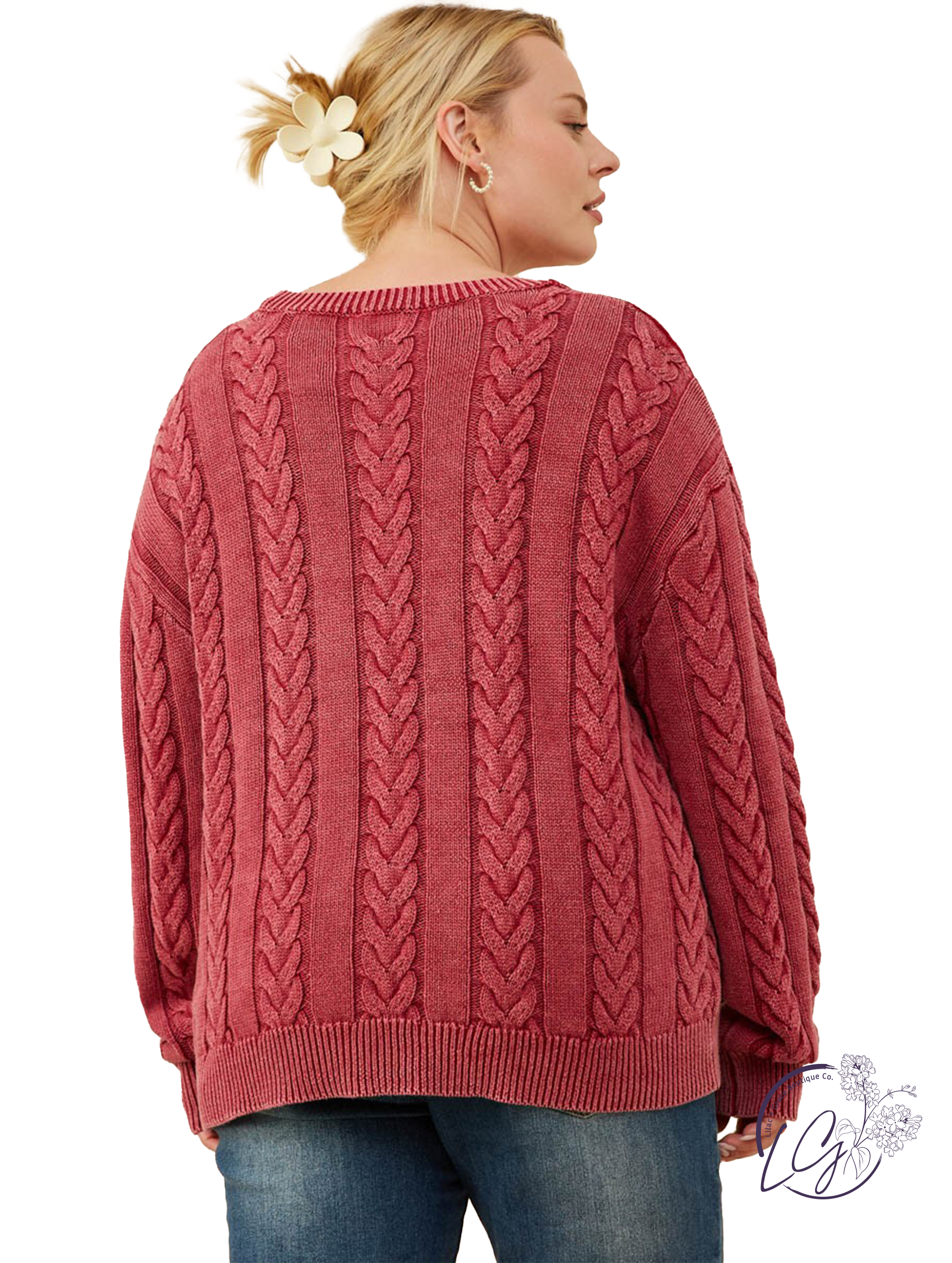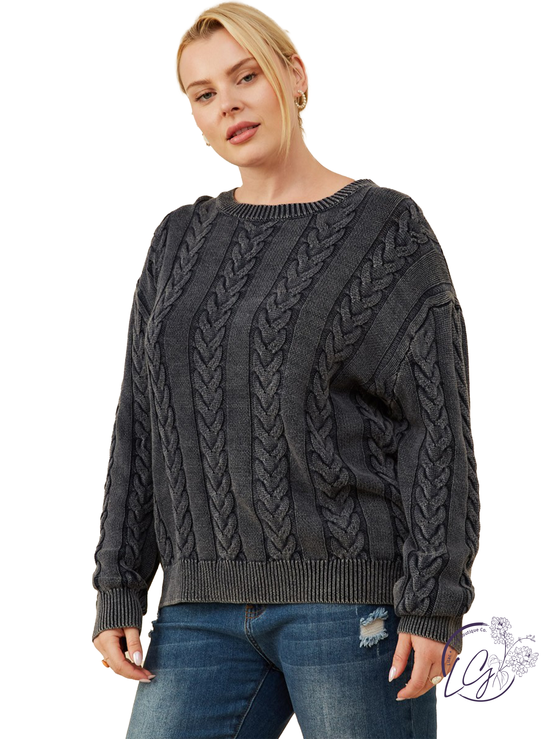 Get cozy and stay stylish with our Plus Cable Knit Washed Pullover Sweater! Made with a washed cable knit design, this sweater boasts a classic round neckline and cuff sleeves for added comfort. Perfect for cooler weather, this sweater will keep you warm while also elevating your wardrobe. Don't miss out on this must-have addition to your closet!