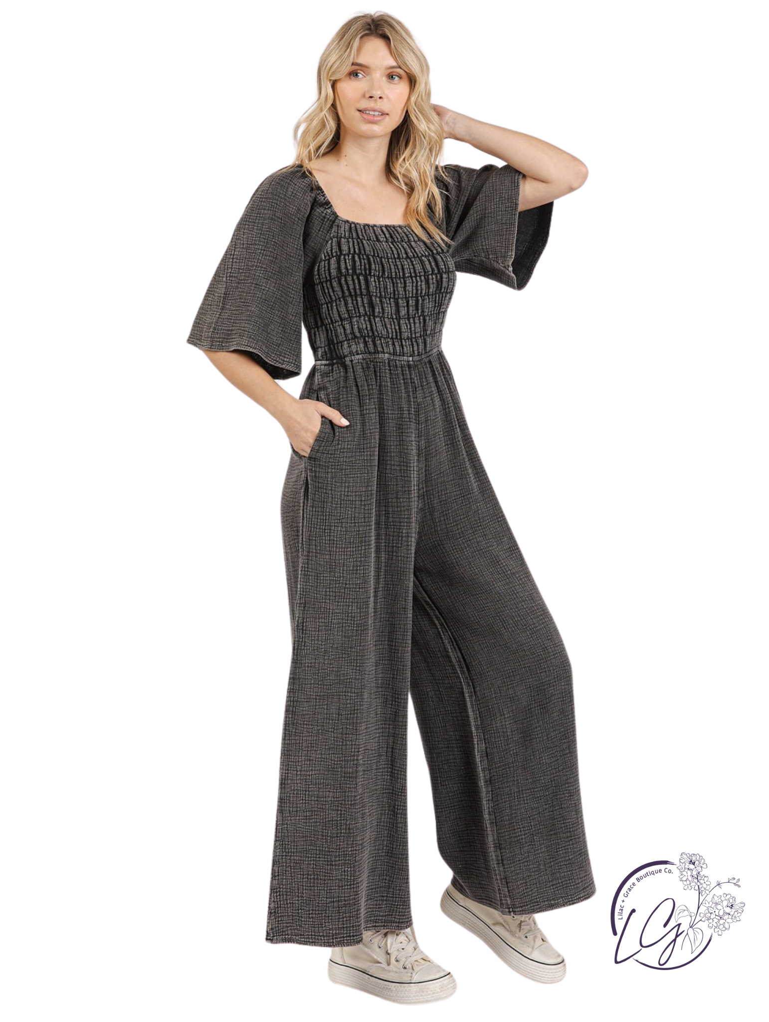 Crafted from mineral washed and softened cotton gauze, this wide leg jumpsuit offers breathable comfort with an easygoing drape. Featuring a square neckline, short sleeves, and delicate ruching at the bust, it blends soft texture with flattering detail.