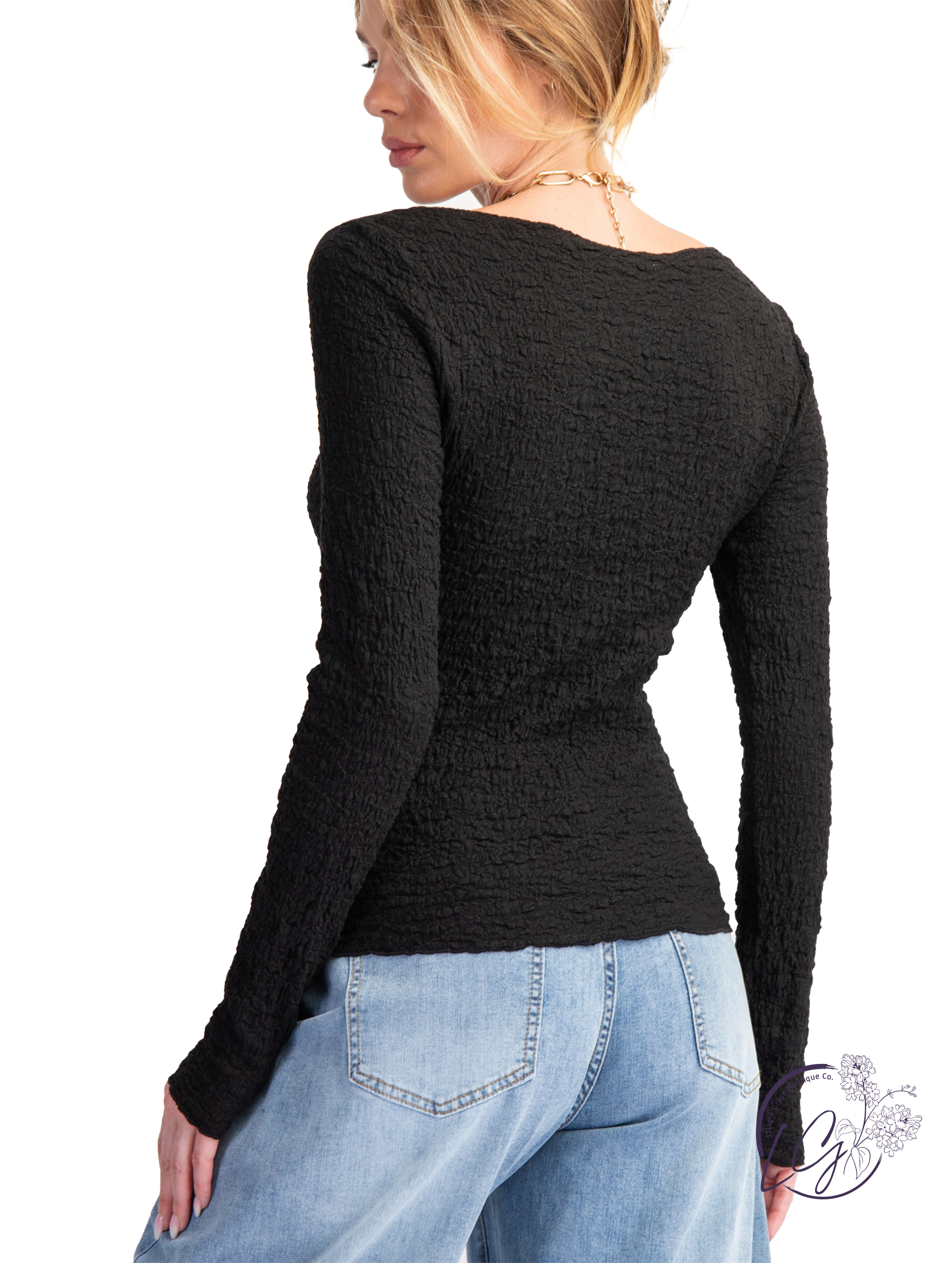 This lightweight popcorn knit top features long sleeves, a rounded neckline, and delicate lettuce edge detailing for a soft, feminine touch. Designed with a fitted silhouette, it’s perfect for layering under jackets, cardigans, or overalls.