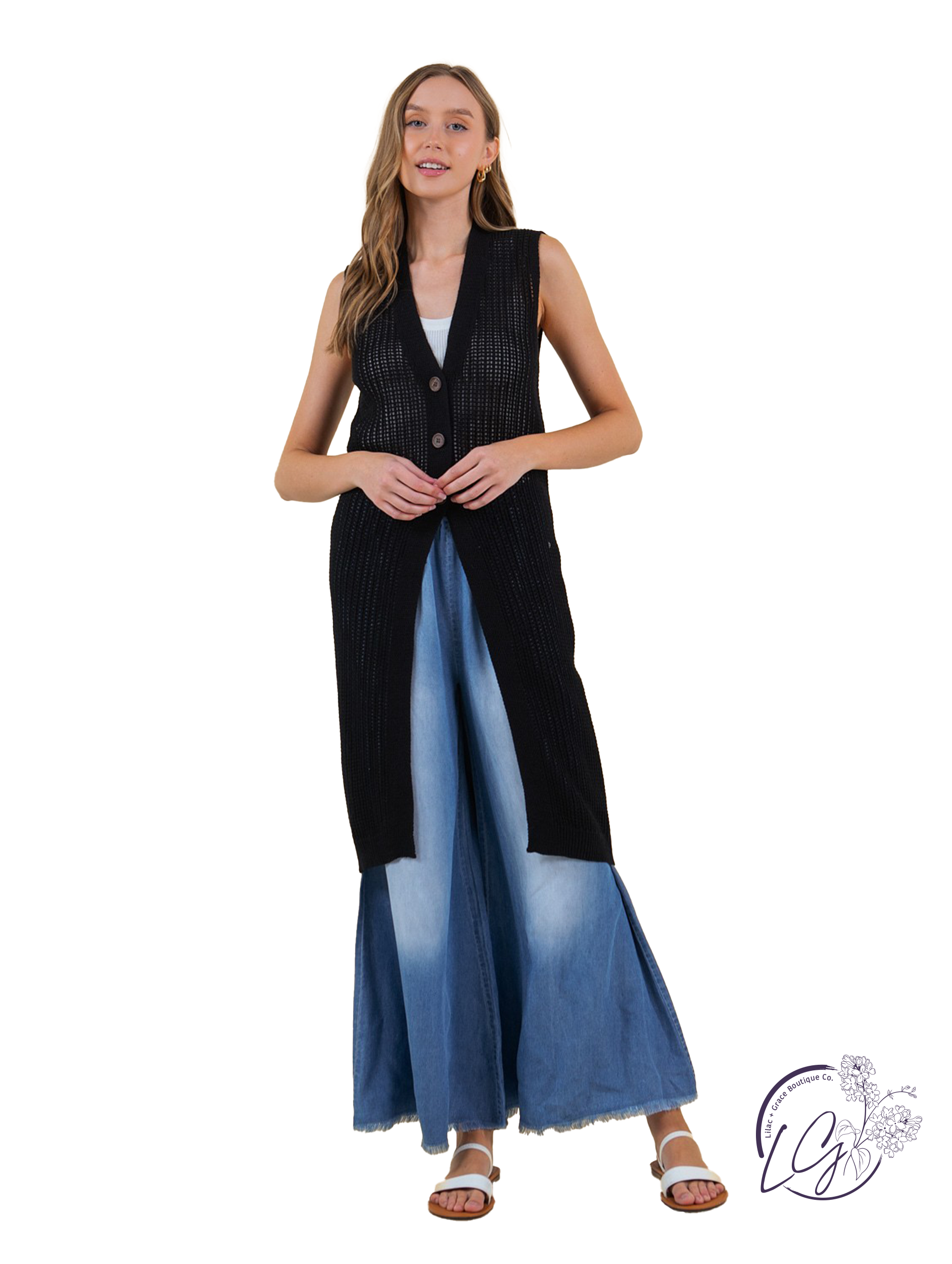 Drape yourself in textured charm with this open-knit cardigan sweater vest, designed for statement layering. Its long-line, sleeveless silhouette flows to a mid-calf length, creating a dreamy, free-spirited feel. A classic V-neckline and three-button front closure add a touch of structure, while side slits at the hem allow for easy movement and a relaxed drape. Crafted from a soft cotton-acrylic blend, this piece is perfect for adding dimension to any look. Layer it over a fitted top and denim for a casually chic vibe or pair it with a flowy dress for a boho-inspired touch.