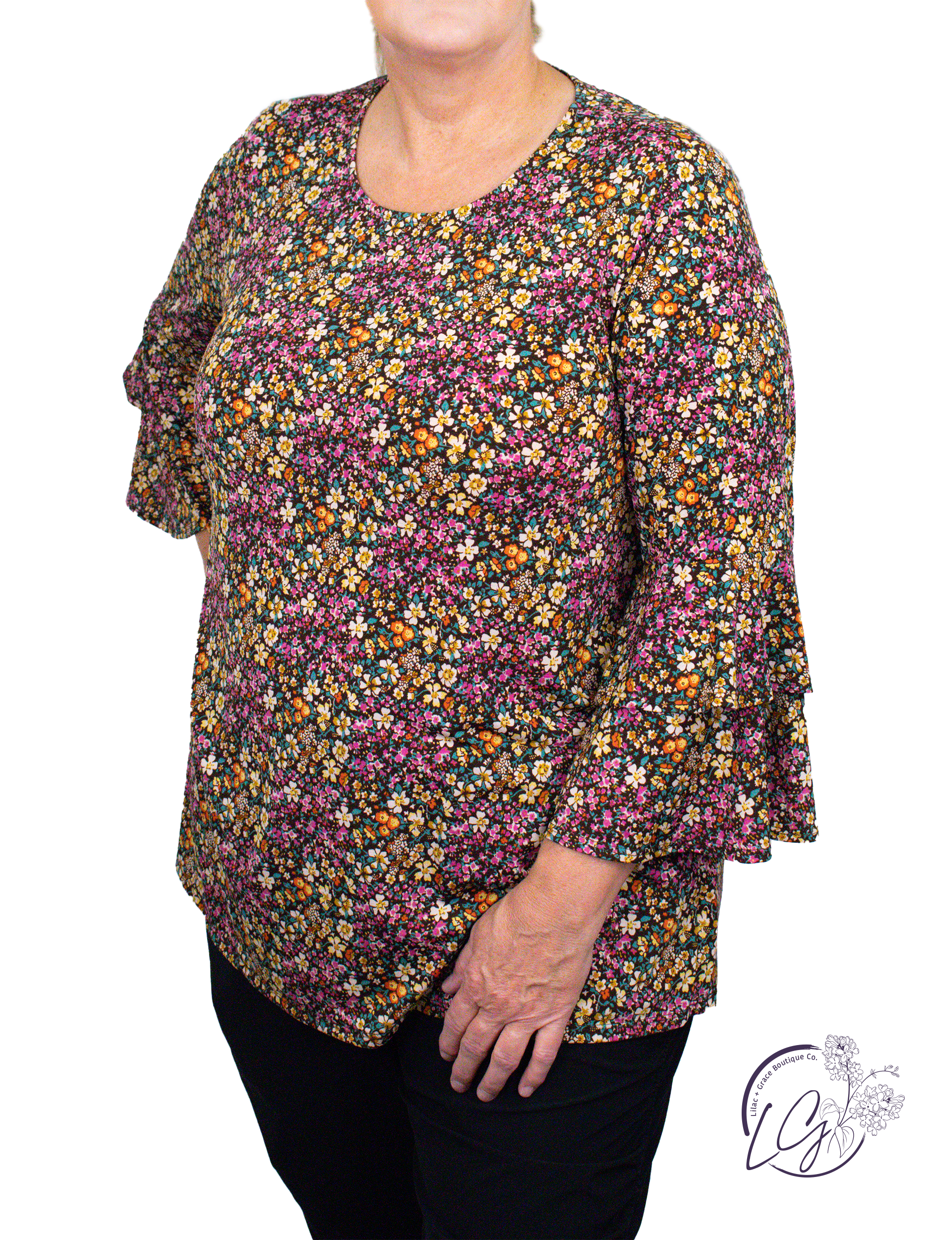 Elevate your style with our Curvy Mocha Top by Dear Scarlett! Featuring tiered bell sleeves, a wrinkle-free printed design, and a relaxed fit, this top is both fashionable and practical. Perfect for dressing up or down, it's also travel-friendly and made with a non-sheer, stretchy knit for added comfort. Upgrade your wardrobe with this must-have blouse!