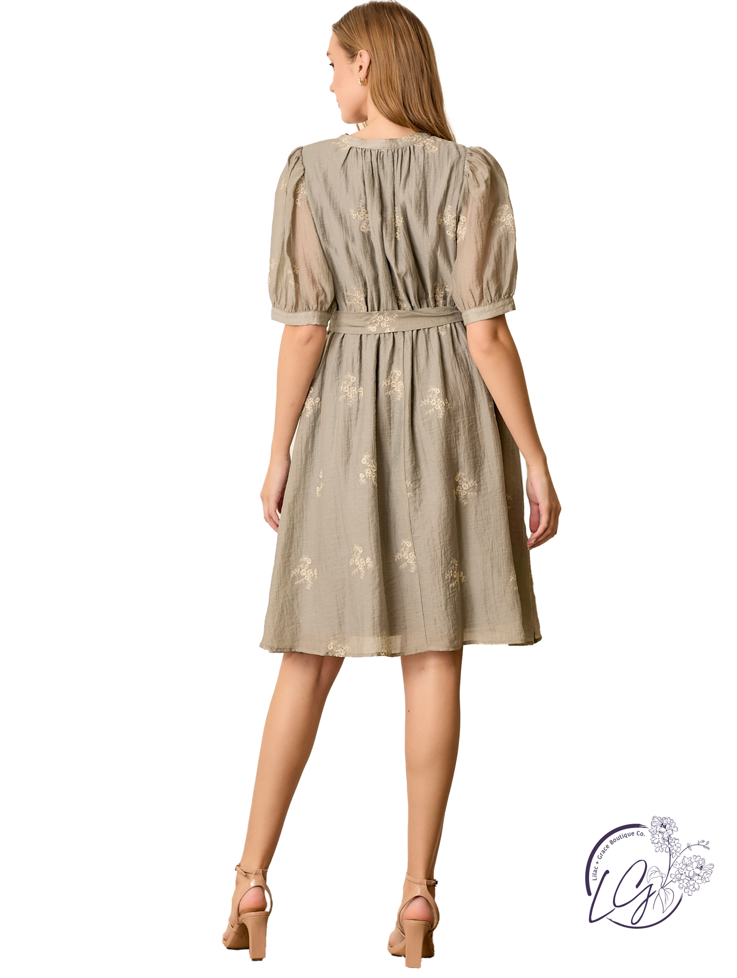 Delicate and detailed, this embroidered dress features a flattering V-neckline and soft short sleeves for a feminine silhouette. A button-front design is accented with a front tie at the waist, adding shape and charm. Intricate embroidery elevates the look, while the lightweight fabric keeps it easy to wear. Style it with woven sandals and a sunhat for a light, everyday ensemble.