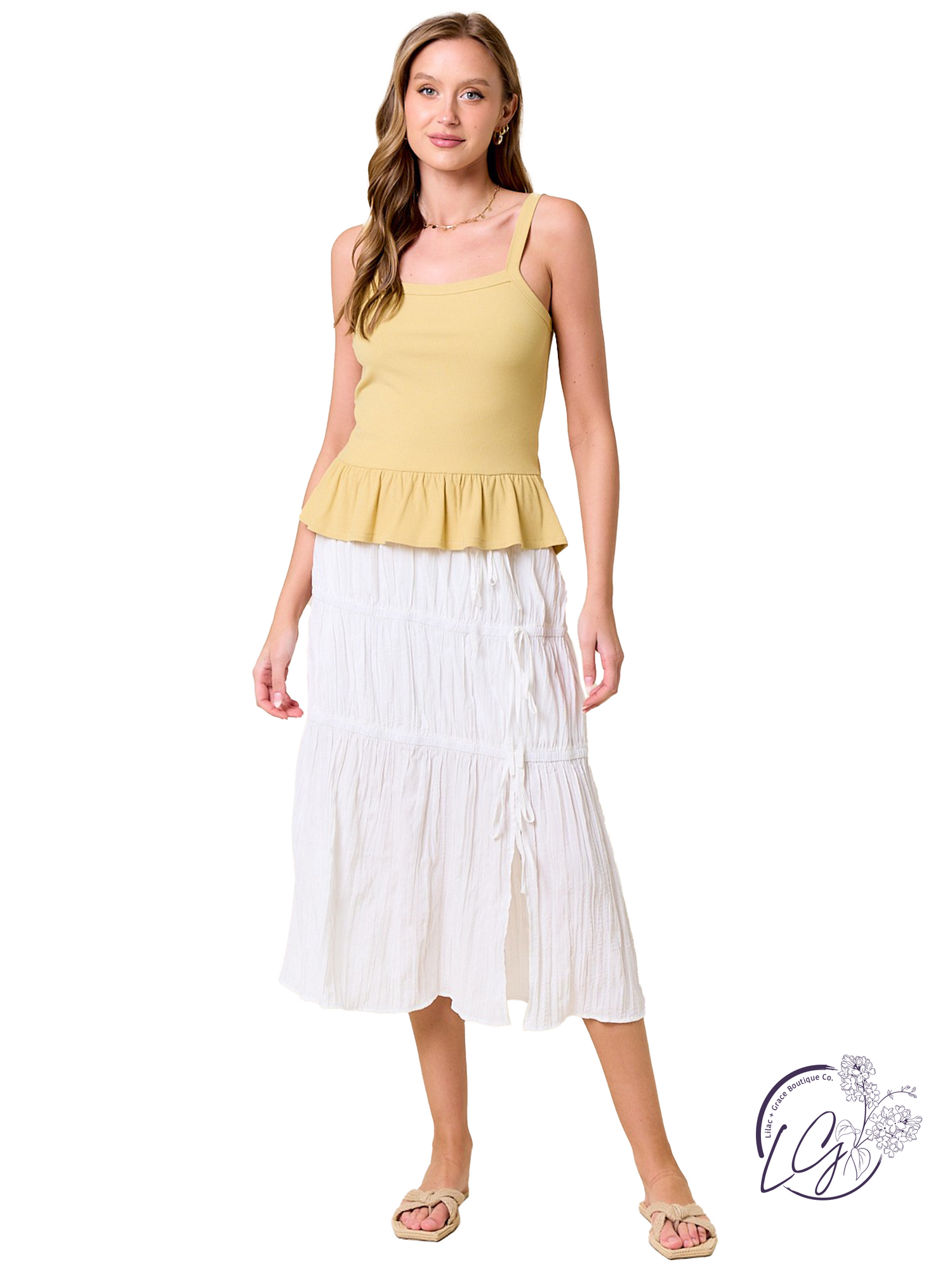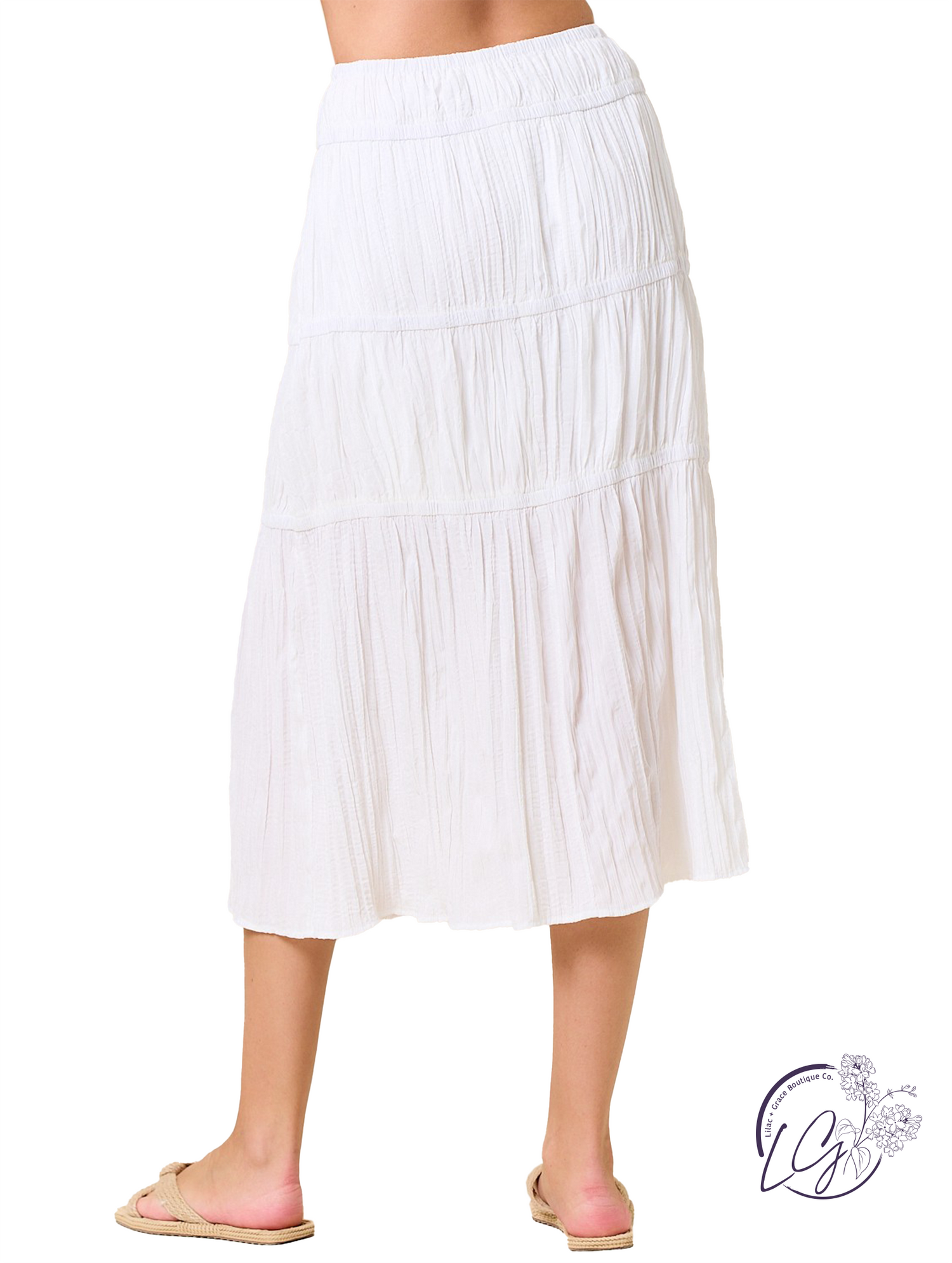 Make a statement with this romantic crinkled woven midi skirt. Featuring an elastic waistband for comfortable pull-on styling, it effortlessly blends style and ease. Three cascading tiers create soft volume, accented by charming bow details along the side. A feminine side slit adds graceful movement, making each step feel free and easy. Pair this skirt with a tucked-in top and sandals for an airy daytime look, or dress it up with heels for a chic evening ensemble.