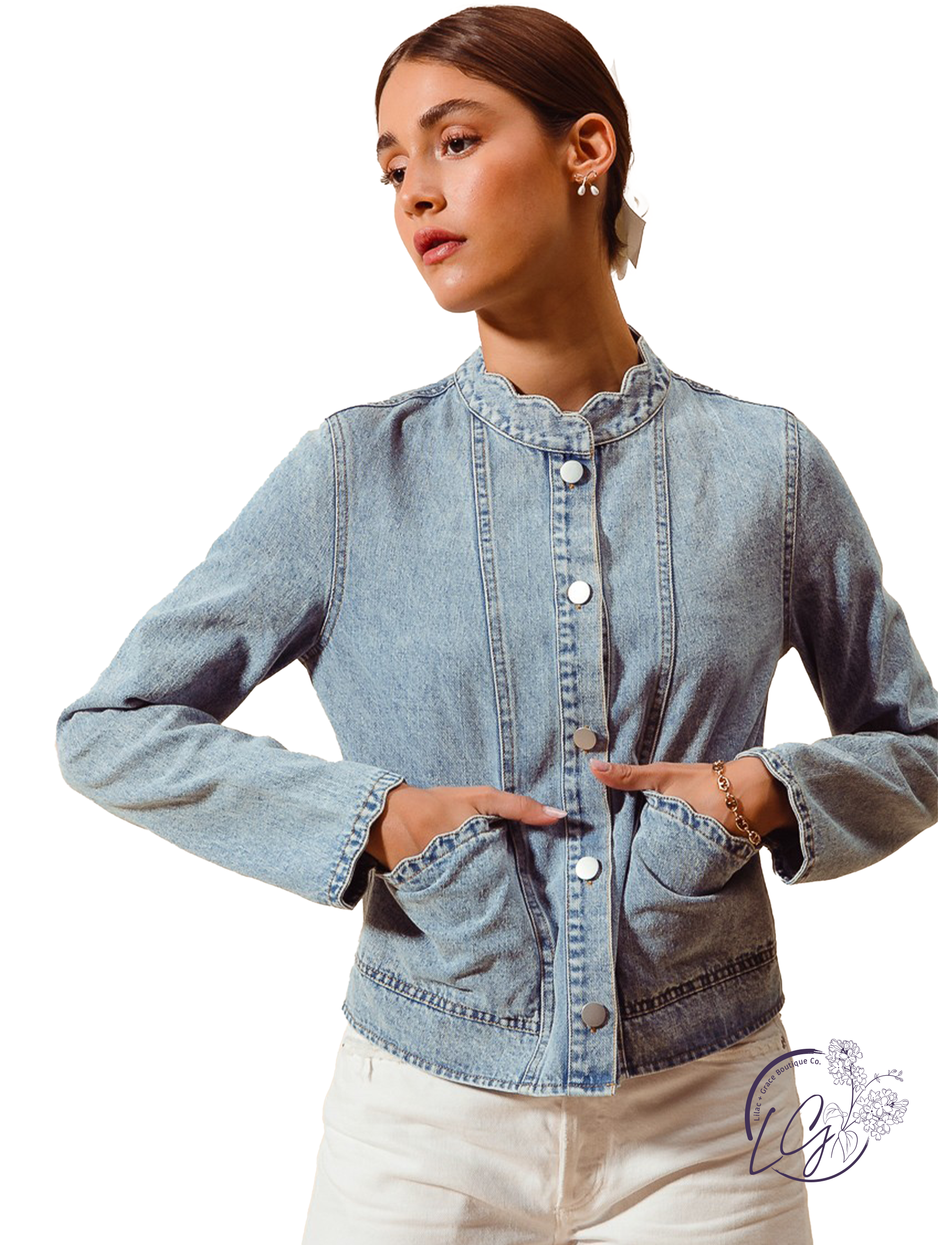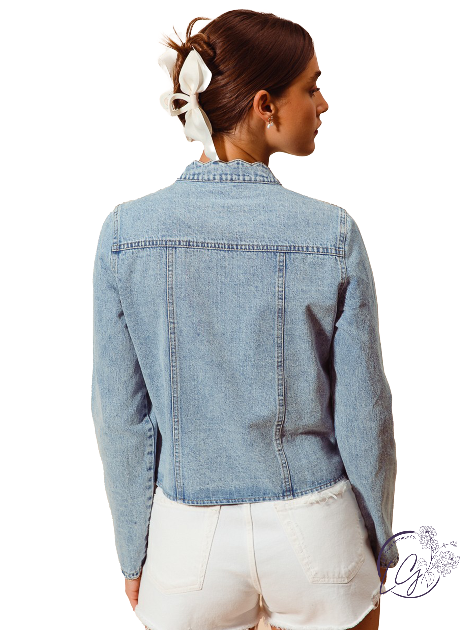 Elevate your style game with our Vintage Cascade Button Up Denim Jacket! Featuring a unique scallop edge detail, this button-up jacket adds a touch of femininity to any outfit. Made from high-quality denim, it provides both comfort and durability. Stand out from the crowd in this one-of-a-kind piece!
