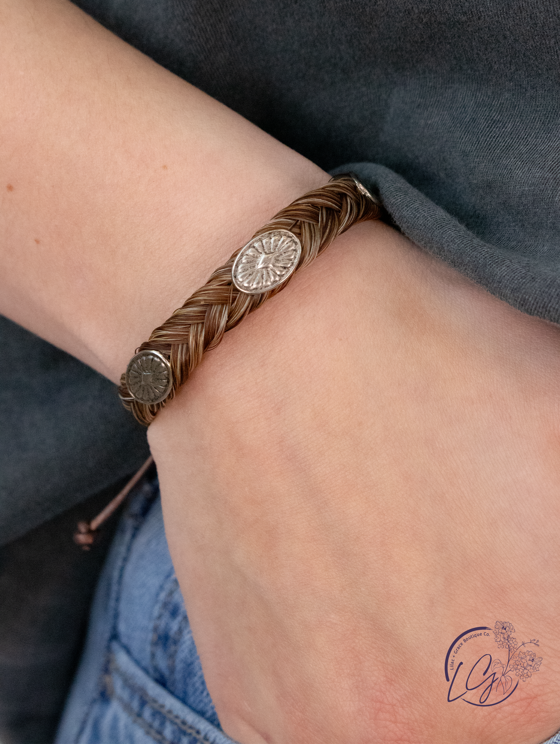 The Virgil Bracelet is named after one of the most famous Bucking horses to come out of Montana. The bracelet features three western style concho as an accent. The bracelet adjusts to fit any size wrist using leather that slides through two pandora style stoppers.