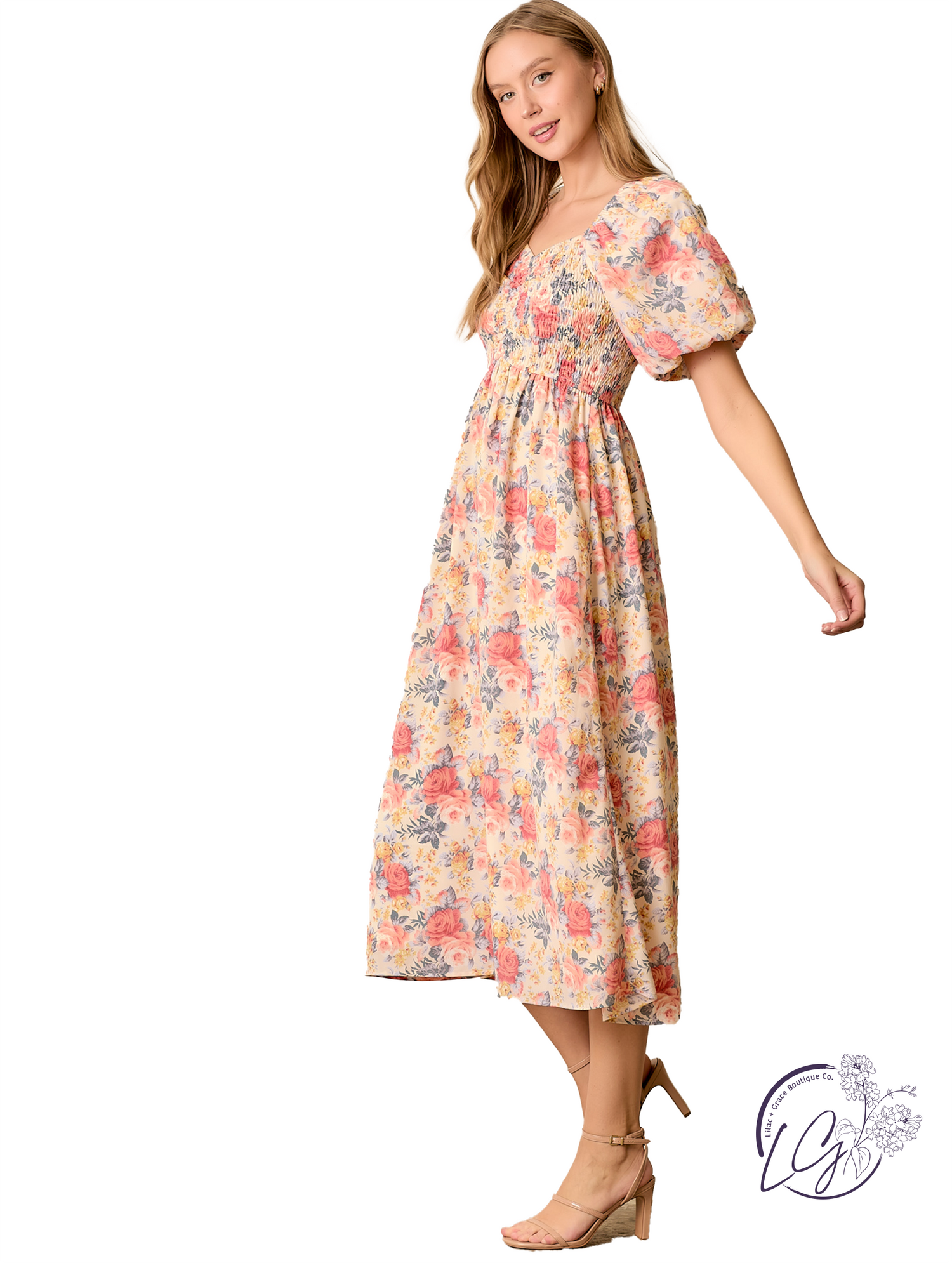 Soft and romantic, this floral printed midi dress features a smocked back and ruched bust for a flattering, form-hugging fit. The sweetheart neckline and gentle gathers add a feminine touch, while the flowy midi-length skirt offers graceful movement. Perfect for daytime dates or weekend outings, pair it with sandals and simple jewelry for an effortlessly pretty look.