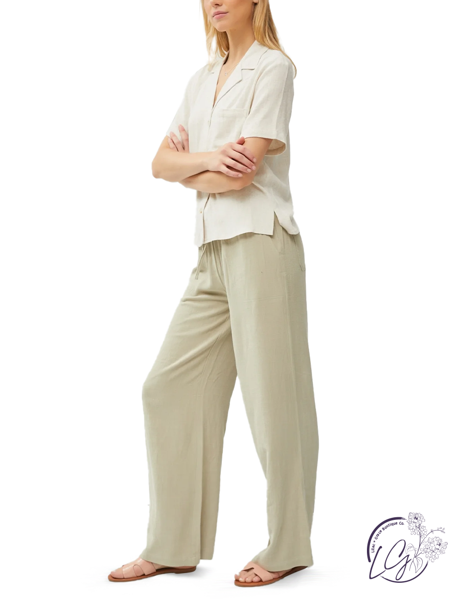 The Airy Wide Leg Trousers are a stylish and comfortable choice for warm weather. Made from a blend of viscose and linen, these pants offer a lightweight and breathable feel. The wide leg silhouette adds a relaxed and airy vibe, perfect for casual outings or lounging at home. With a comfortable elastic waistband and flowy drape, these pants provide ease of movement and a flattering fit.