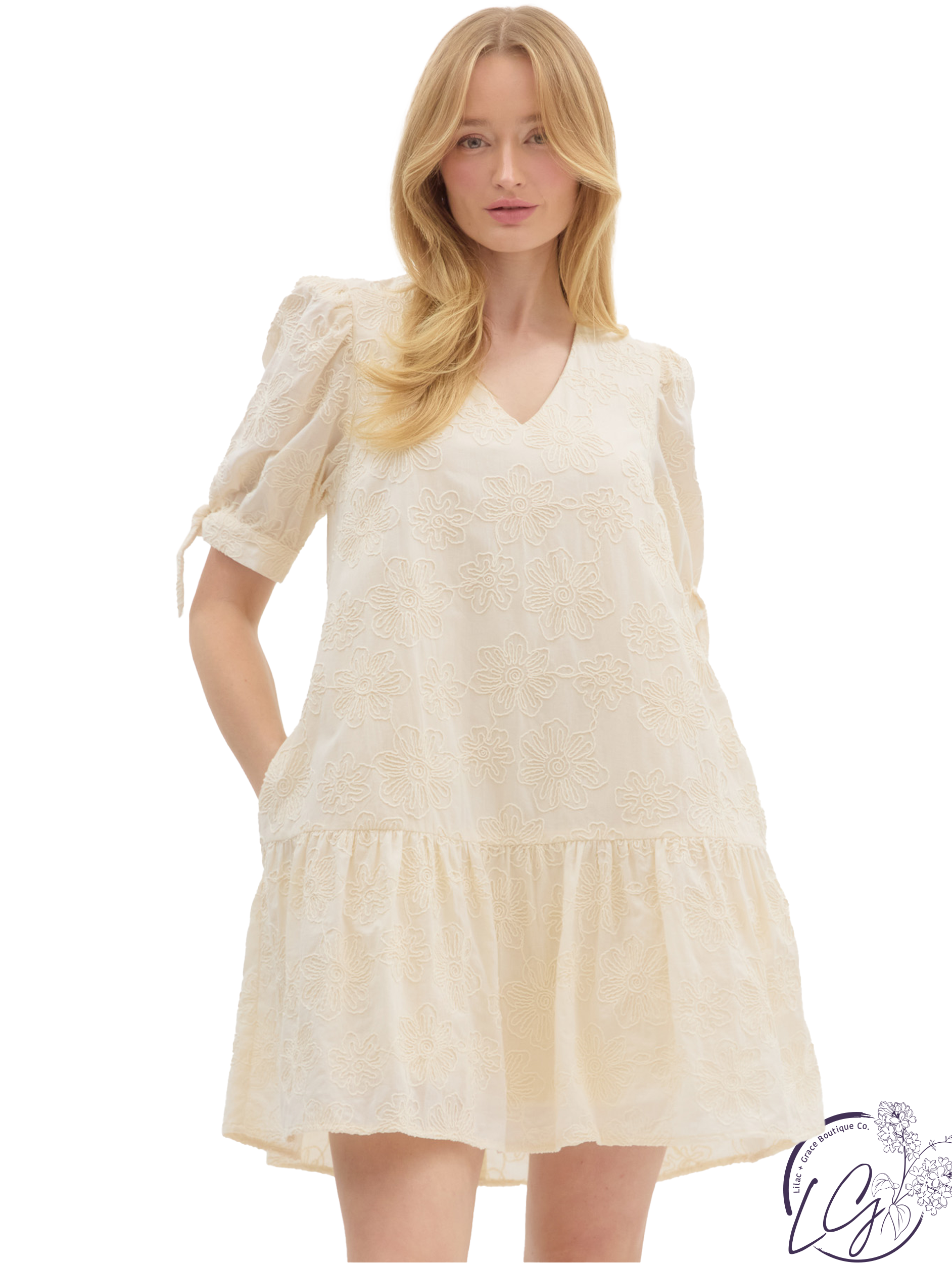 This floral appliqué mini dress features a soft V-neckline and a playful ruffle hem that adds movement and charm. Crafted in a pullover style, it’s easy to wear with delicate appliqué detailing that brings subtle texture. Perfect for casual days or dressed-up plans—just add sandals or low heels for a fresh, feminine look.