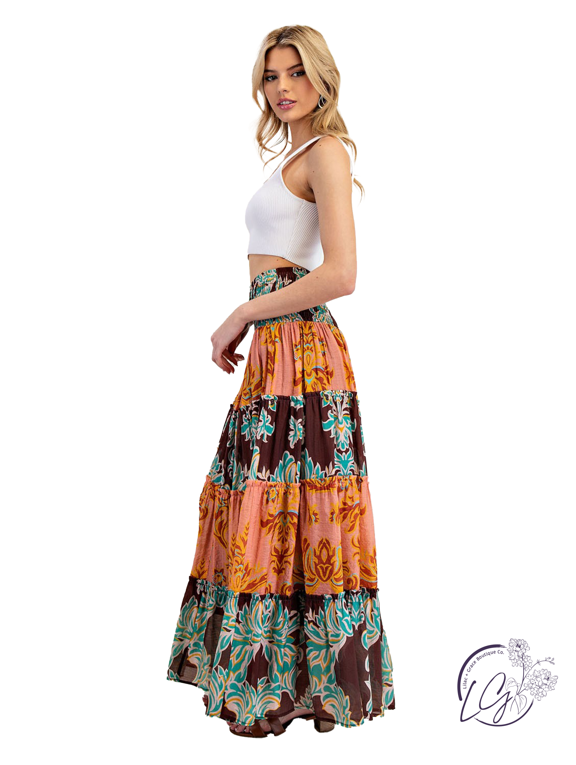 This boho-inspired tiered maxi skirt features a smocked waistband for a flexible, comfortable fit and a bold mix of prints that add personality to every tier. The flowy A-line silhouette moves with ease, making it perfect for sunny days, market strolls, or casual gatherings. Pair it with a simple tank or cropped blouse for a vibrant, free-spirited look.