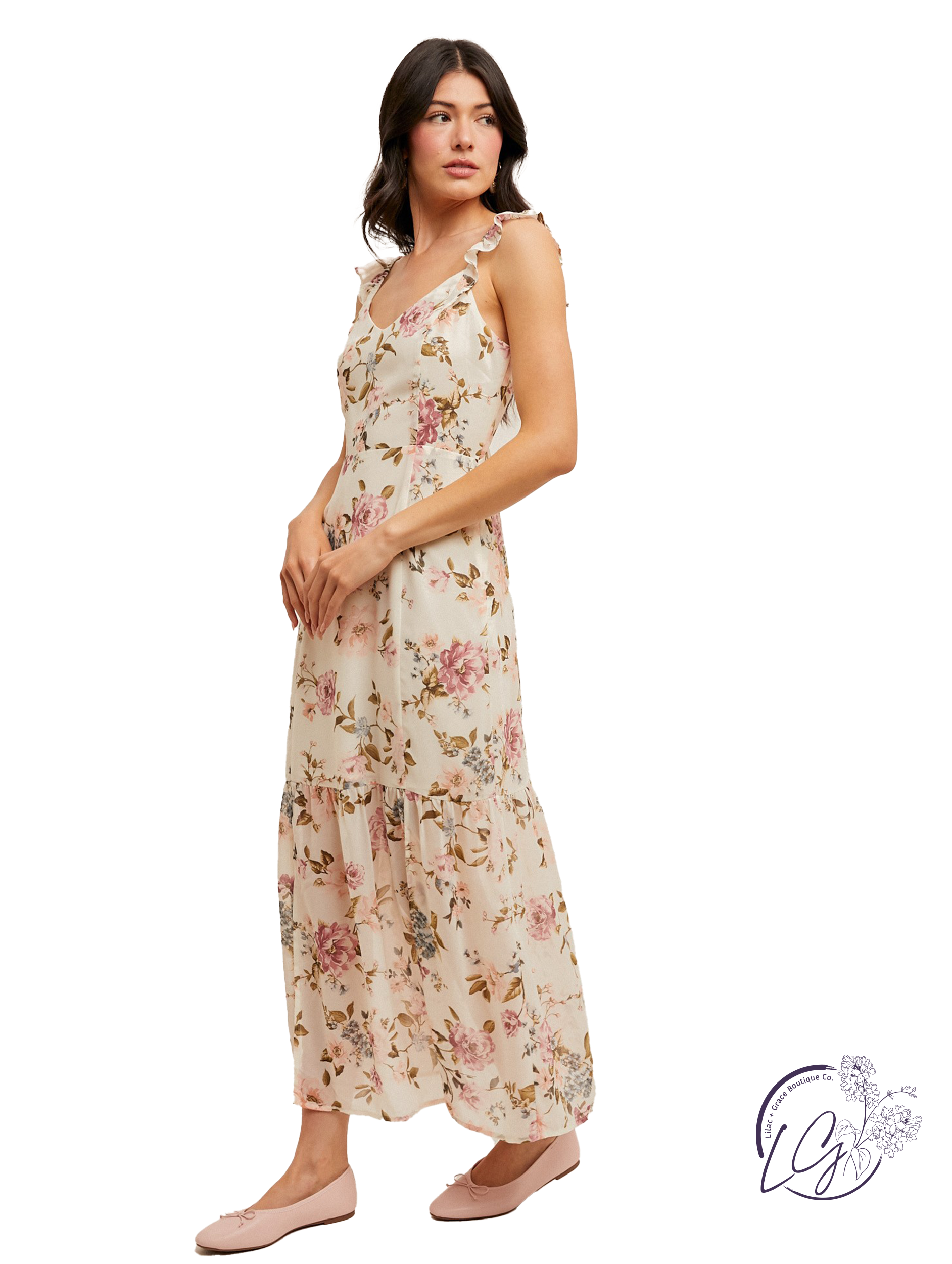 This floral chiffon maxi dress features a soft, flowing silhouette with a back cutout detail that adds a touch of drama and breathability. The lightweight chiffon fabric drapes beautifully, while the allover floral print brings a romantic, airy feel. Ideal for weddings, vacations, or sunset dinners—just pair with delicate accessories and sandals for an effortless finish.