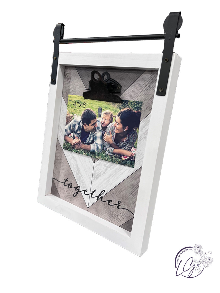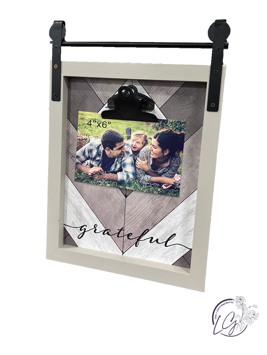 This vintage photo frame hanging from a barn door hanger is perfect for giving your pictures that special extra touch.